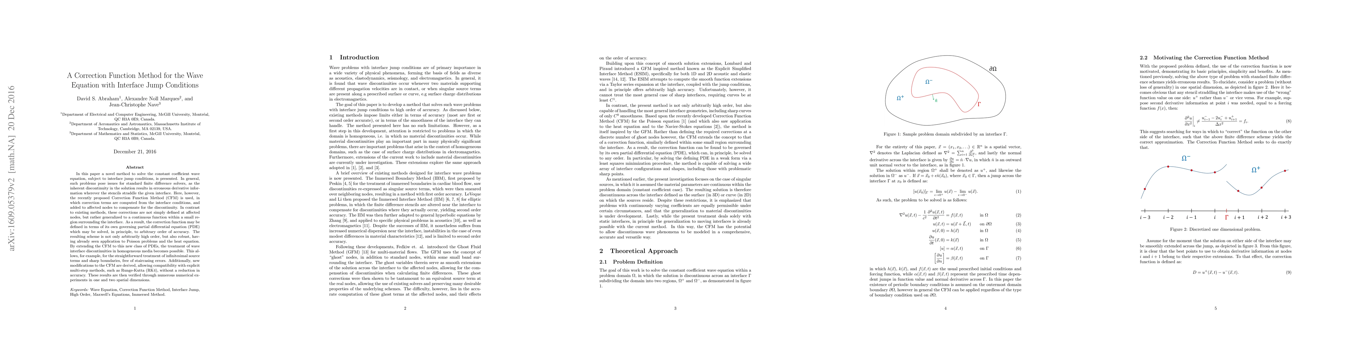 This paper introduces a novel Correction Function Method (CFM) to solve the constant coefficient wave equation with interface jump conditions, addressing the inherent discontinuity issues in standard finite difference solvers. The CFM generalizes correction terms to a continuous function around the interface, enabling high-order accuracy and robustness, and is verified through numerical experiments.