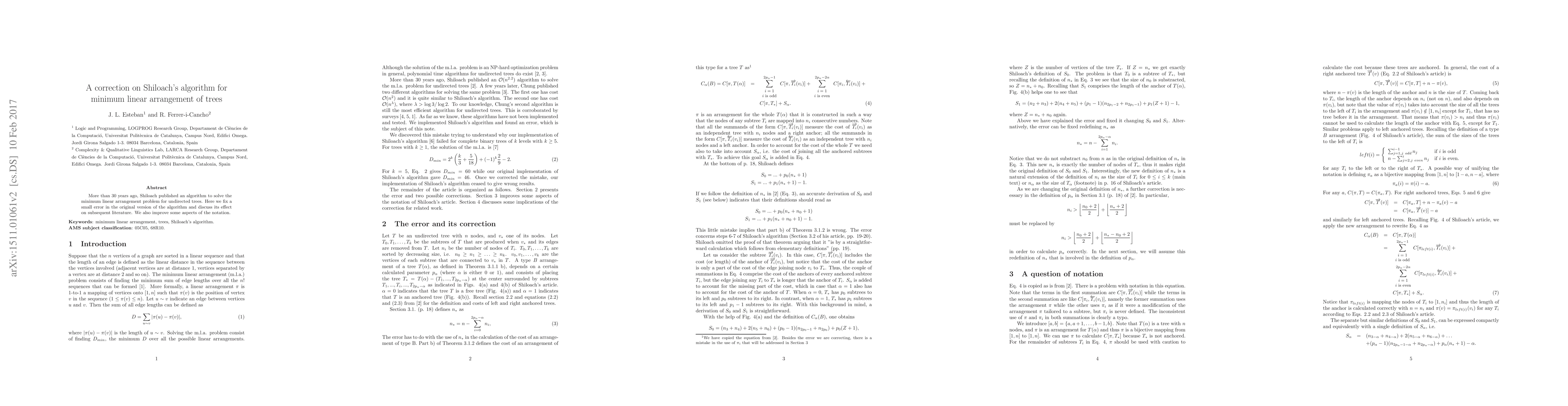 More than 30 years ago, Shiloach published an algorithm to solve the minimum linear arrangement problem for undirected trees. Here we fix a small error in the original version of the algorithm and discuss its effect on subsequent literature. We also improve some aspects of the notation.