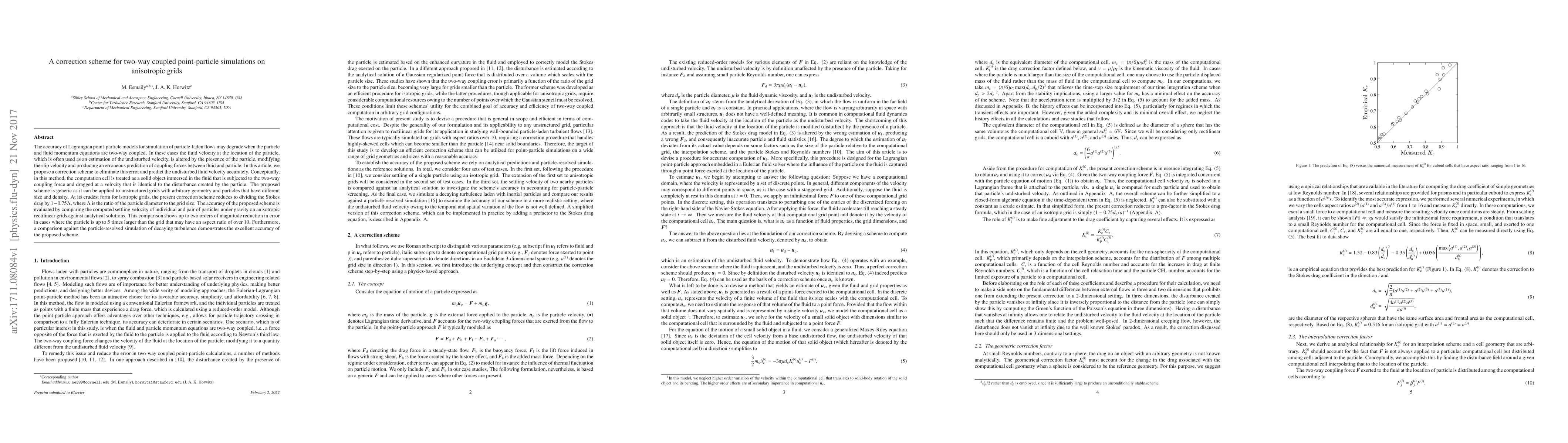 This paper proposes a correction scheme to accurately predict the undisturbed fluid velocity in two-way coupled particle-laden flow simulations, addressing errors caused by particle-induced velocity changes. The method treats the computation cell as a solid object subjected to coupling forces and is shown to significantly reduce error in simulations on anisotropic grids.