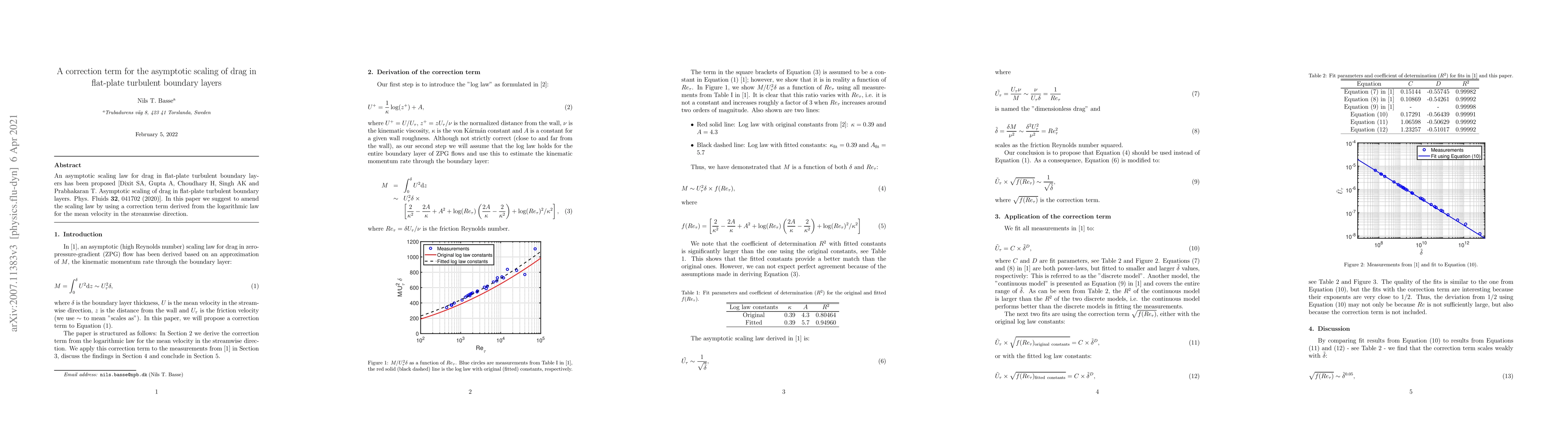 An asymptotic scaling law for drag in flat-plate turbulent boundary layers has been proposed [Dixit SA, Gupta A, Choudhary H, Singh AK and Prabhakaran T. Asymptotic scaling of drag in flat-plate turbulent boundary layers. Phys. Fluids Vol. 32, 041702 (2020)]. In this paper we suggest to amend the scaling law by using a correction term derived from the logarithmic law for the mean velocity in the streamwise direction.