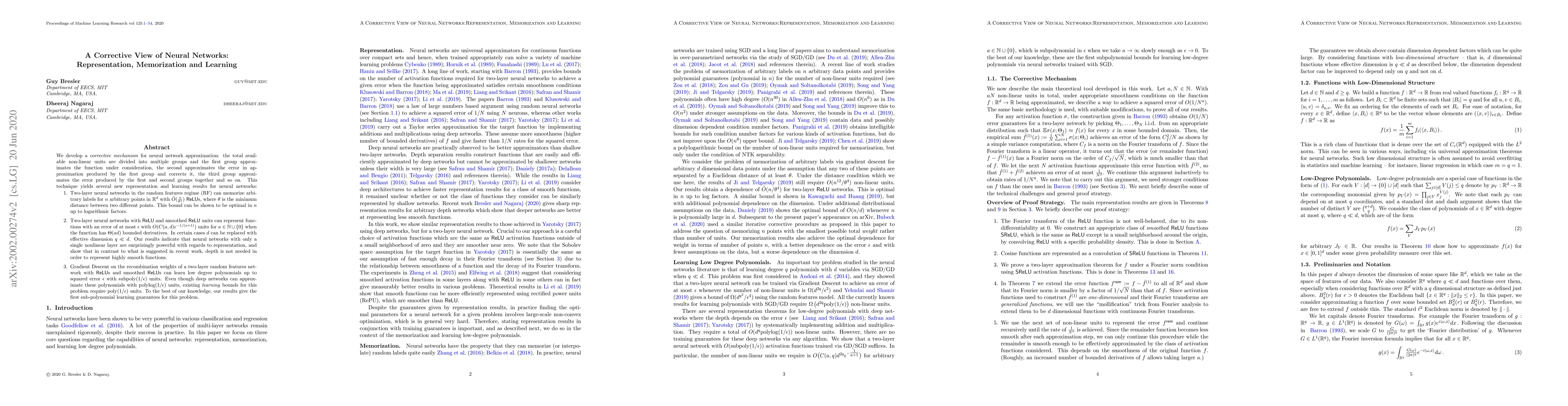 We develop a corrective mechanism for neural network approximation: the total available non-linear units are divided into multiple groups and the first group approximates the function under consideration, the second group approximates the error in approximation produced by the first group and corrects it, the third group approximates the error produced by the first and second groups together and so on. This technique yields several new representation and learning results for neural networks. First, we show that two-layer neural networks in the random features regime (RF) can memorize arbitrary labels for arbitrary points under under Euclidean distance separation condition using $\tilde{O}(n)$ ReLUs which is optimal in $n$ up to logarithmic factors. Next, we give a powerful representation result for two-layer neural networks with ReLUs and smoothed ReLUs which can achieve a squared error of at most $\epsilon$ with $O(C(a,d)\epsilon^{-1/(a+1)})$ for $a \in \mathbb{N}\cup\{0\}$ when the function is smooth enough (roughly when it has $\Theta(ad)$ bounded derivatives). In certain cases $d$ can be replaced with effective dimension $q \ll d$. Previous results of this type implement Taylor series approximation using deep architectures. We also consider three-layer neural networks and show that the corrective mechanism yields faster representation rates for smooth radial functions. Lastly, we obtain the first $O(\mathrm{subpoly}(1/\epsilon))$ upper bound on the number of neurons required for a two layer network to learn low degree polynomials up to squared error $\epsilon$ via gradient descent. Even though deep networks can express these polynomials with $O(\mathrm{polylog}(1/\epsilon))$ neurons, the best learning bounds on this problem require $\mathrm{poly}(1/\epsilon)$ neurons.