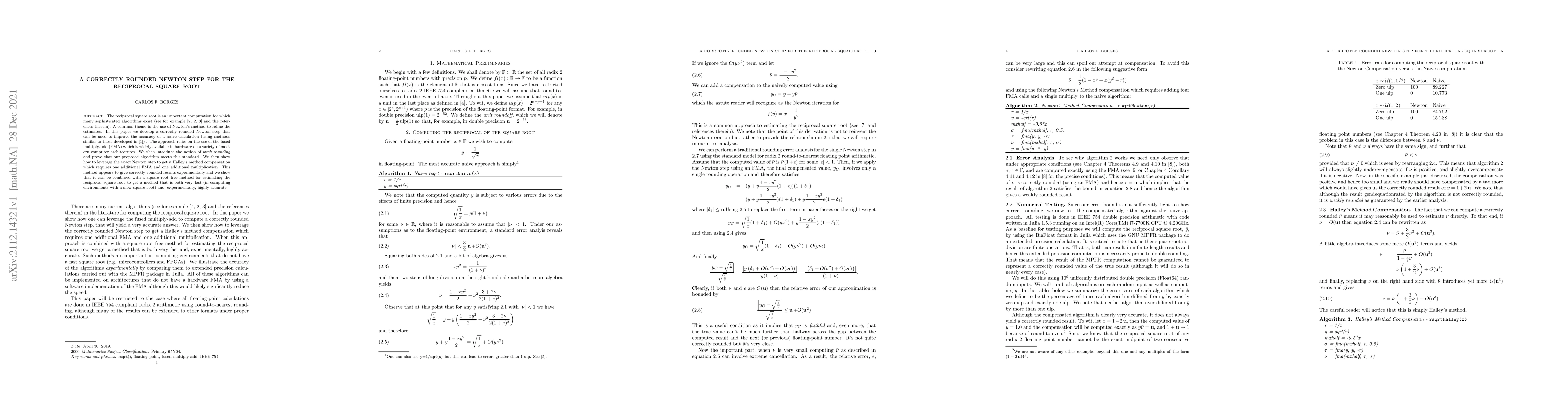 This paper develops a correctly rounded Newton step utilizing fused multiply-add (FMA) to enhance the accuracy of reciprocal square root computations. It introduces weak rounding and proposes a Halley's method compensation that requires minimal additional operations, achieving both speed and high accuracy experimentally.