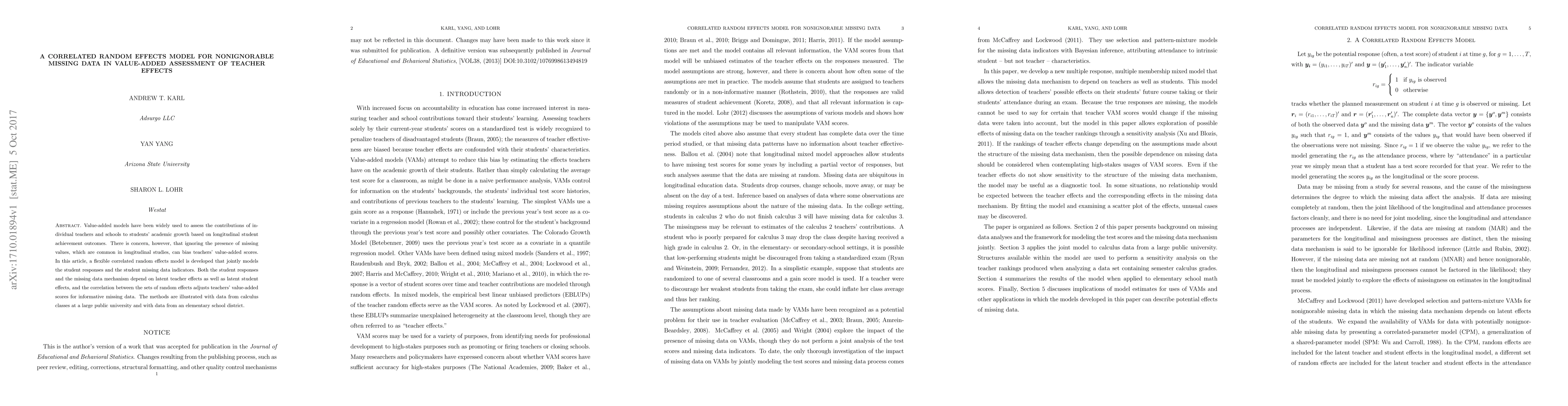 Value-added models have been widely used to assess the contributions of individual teachers and schools to students' academic growth based on longitudinal student achievement outcomes. There is concern, however, that ignoring the presence of missing values, which are common in longitudinal studies, can bias teachers' value-added scores. In this article, a flexible correlated random effects model is developed that jointly models the student responses and the student missing data indicators. Both the student responses and the missing data mechanism depend on latent teacher effects as well as latent student effects, and the correlation between the sets of random effects adjusts teachers' value-added scores for informative missing data. The methods are illustrated with data from calculus classes at a large public university and with data from an elementary school district.