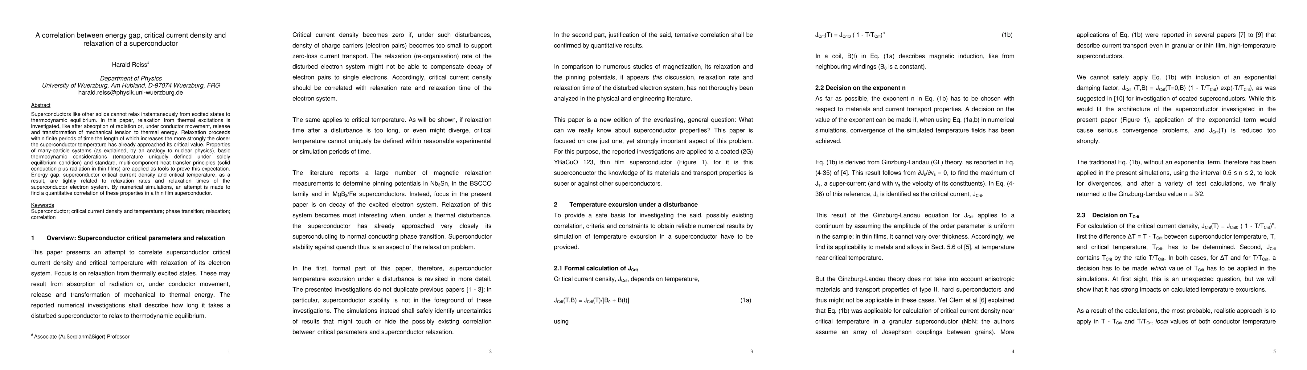 Superconductors like other solids cannot relax instantaneously from excited states to thermodynamic equilibrium. In this paper, relaxation from thermal excitations is investigated, like after absorption of radiation or, under conductor movement, release and transformation of mechanical tension to thermal energy. Relaxation proceeds within finite periods of time the length of which increases the more strongly the closer the superconductor temperature has already approached its critical value. Properties of many-particle systems (as explained, by an analogy to nuclear physics), basic thermodynamic considerations (temperature uniquely defined under solely equilibrium condition) and standard, multi-component heat transfer principles (solid conduction plus radiation in thin films) are applied as tools to prove this expectation. Energy gap, superconductor critical current density and critical temperature, as a result, are tightly related to relaxation rates and relaxation times of the superconductor electron system. By numerical simulations, an attempt is made to find a quantitative correlation of these properties in a thin film superconductor.