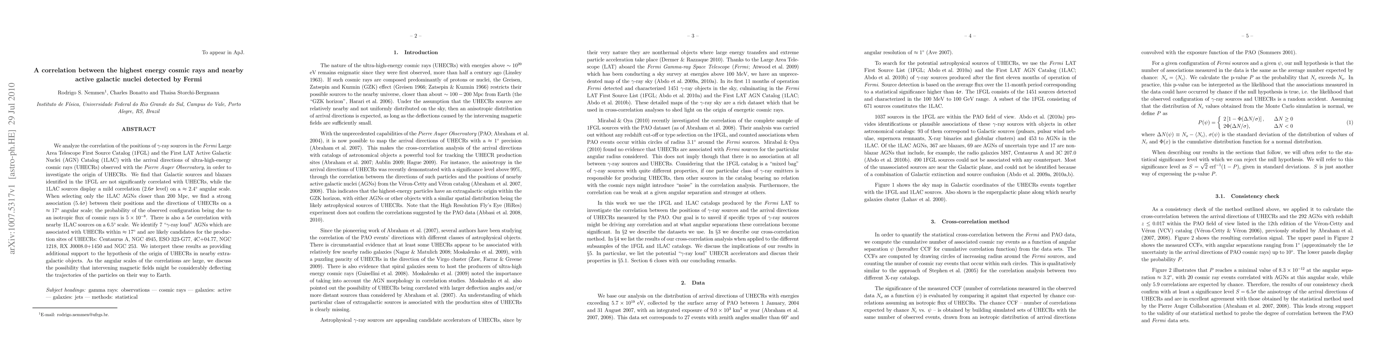 This study investigates the correlation between ultra-high-energy cosmic rays (UHECRs) and nearby active galactic nuclei (AGNs) detected by Fermi and the Pierre Auger Observatory. The analysis reveals a strong association (5.4 sigma) between UHECRs and nearby AGNs within 200 Mpc, suggesting these AGNs may be production sites for UHECRs, though large angular scales hint at possible deflections by intervening magnetic fields.
