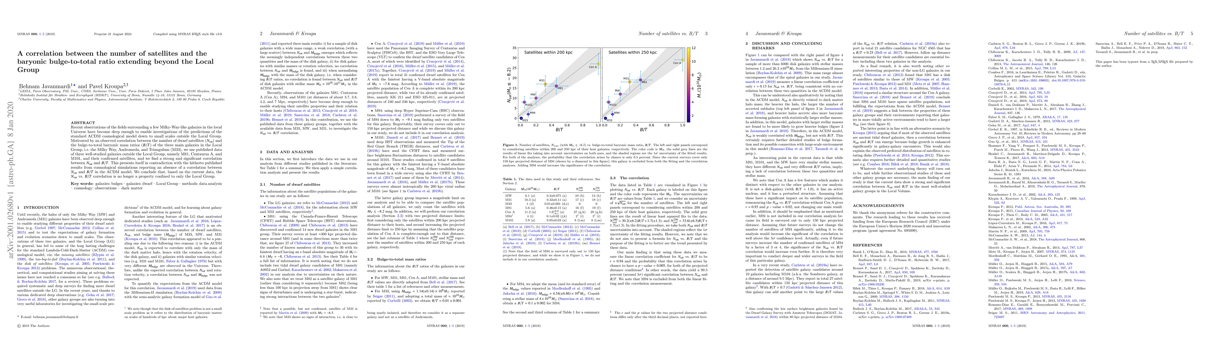 A correlation between the number of satellites and baryonic bulge-to-total mass ratios is found in galaxies outside the Local Group, contradicting previous simulations.