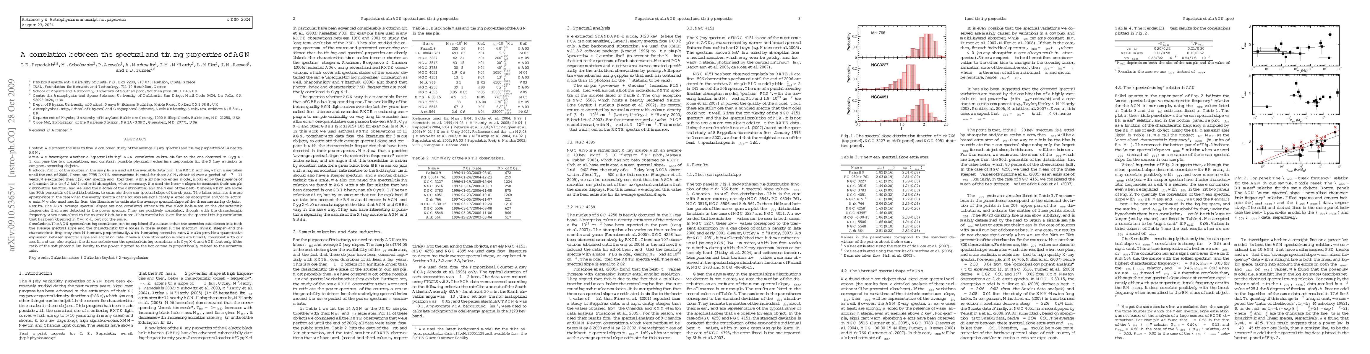 We present the results from a combined study of the average X-ray spectral and timing properties of 14 nearby AGN. For 11 of the sources in the sample, we used all the available data from the RXTE archive, which were taken until the end of 2006. There are 7795 RXTE observations in total for these AGN, obtained over a period of ~7-11 years. We extracted their 3-20 keV spectra and fitted them with a simple power-law model, modified by the presence of a Gaussian line (at 6.4 keV) and cold absorption, when necessary. We used these best-fit slopes to estimate the mean spectral slope for each object, while we used results from the literature to estimate the average spectral slope of the three objects without archival, monitorin RXTE data. Our results show that the AGN average spectral slopes are not correlated either with the black hole mass or the characteristic frequencies that were detected in the power spectra.They are positively correlated, though, with the characteristic frequency when normalised to the sources black hole mass. This is similar to the spectral-timing correlation that has been observed in Cyg X-1, but not the same.The AGN spectral-timing correlation can be explained if we assume that the accretion rate determines both the average spectral slope and the characteristic time scales in AGN. The spectrum should steepen and the characteristic frequency should increase, proportionally, with increasing accretion rate. We also provide a quantitative expression between spectral slope and accretion rate. Thermal Comptonisation models are broadly consistent with our result, but only if the ratio of the soft photons' luminosity to the power injected to the hot corona is proportionally related to the accretion rate.