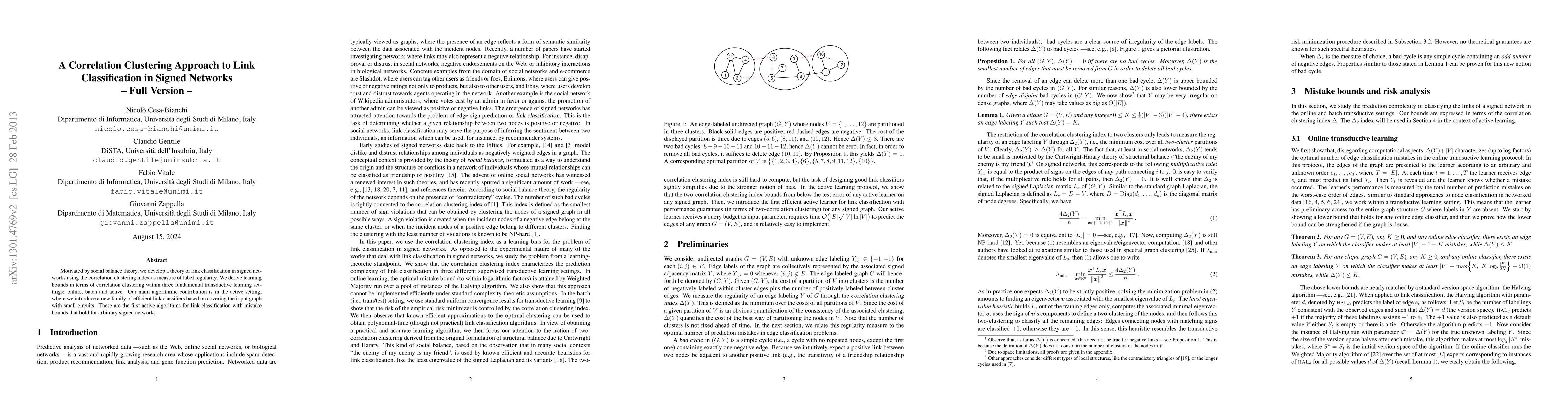 This paper proposes a correlation clustering approach for link classification in signed networks, deriving learning bounds across online, batch, and active settings. The key contribution is a new family of active link classifiers based on covering the graph with small circuits, providing the first mistake-bound algorithms for arbitrary signed networks.