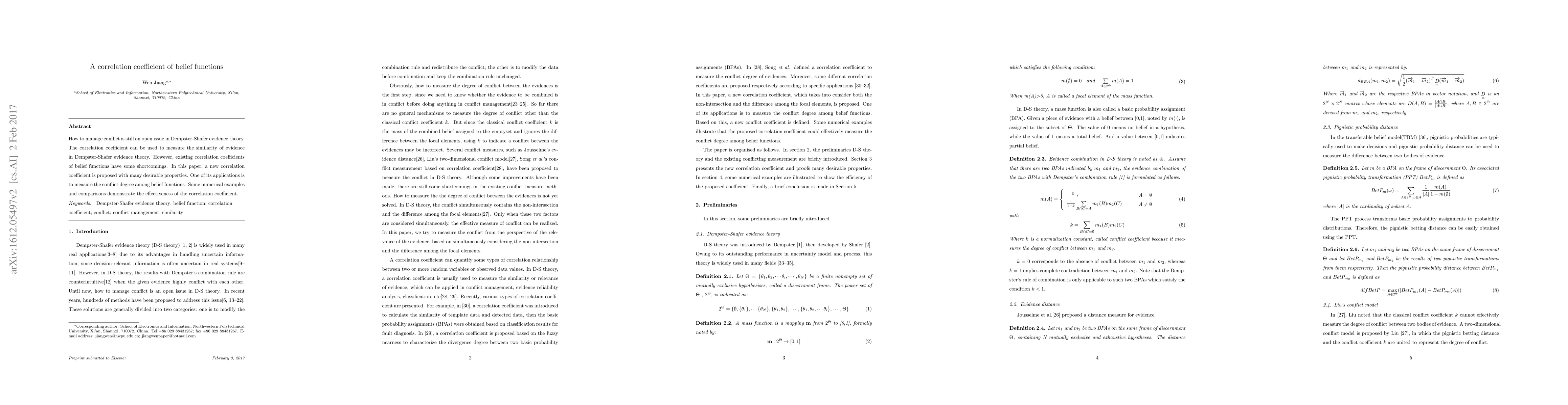 This paper proposes a new correlation coefficient for belief functions in Dempster-Shafer evidence theory to better manage conflict and measure the similarity of evidence, addressing limitations of existing methods. Numerical examples demonstrate its effectiveness in assessing conflict degrees among belief functions.