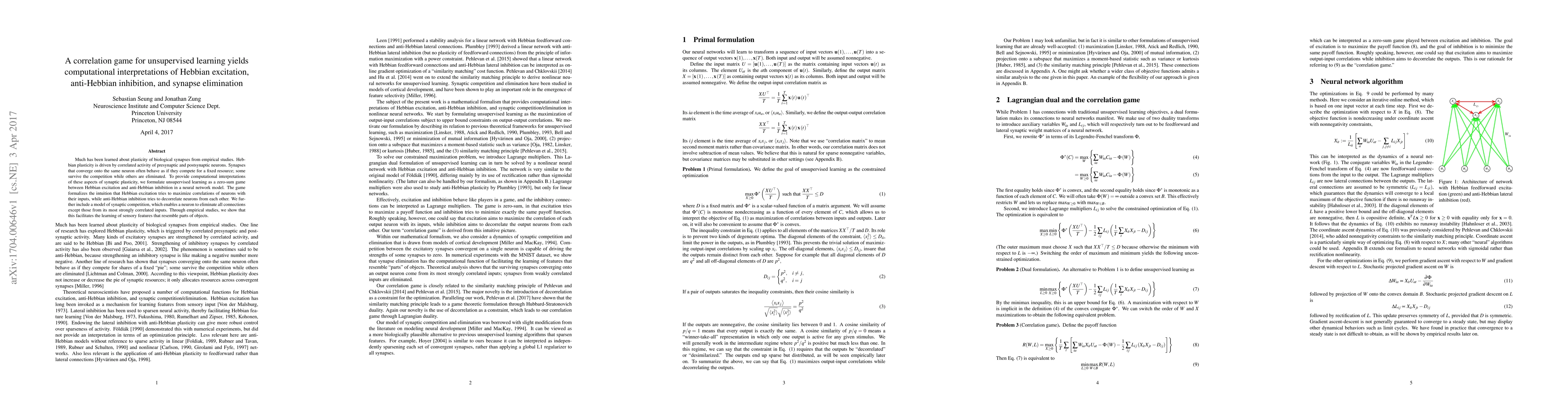 This paper formulates unsupervised learning as a zero-sum game that interprets Hebbian excitation and anti-Hebbian inhibition, and introduces a model for synaptic competition leading to synapse elimination. The approach facilitates learning of sensory features by maximizing correlations and eliminating less relevant connections.