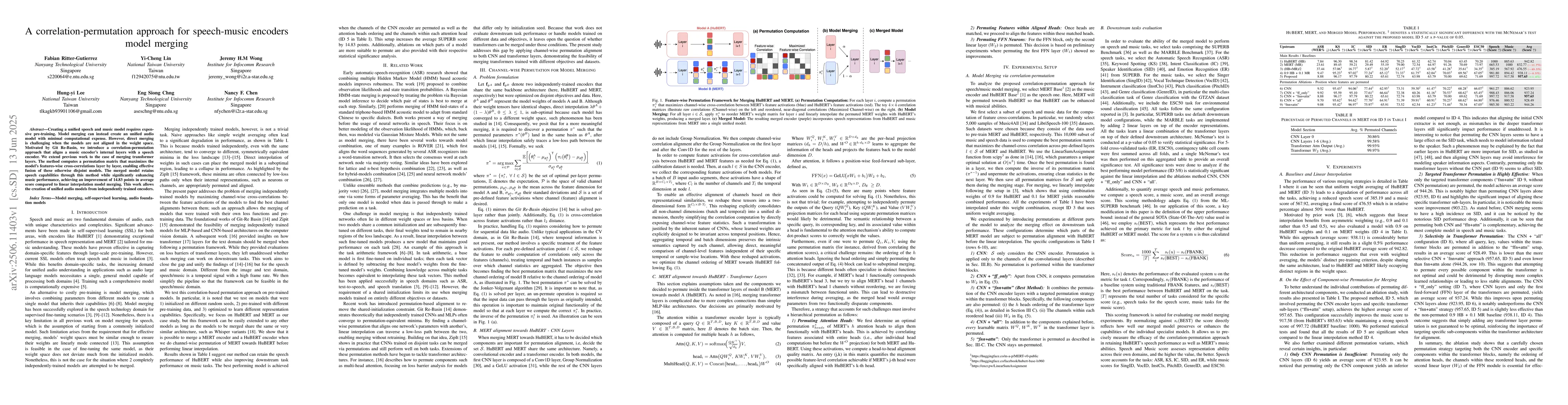 The research introduces a correlation-permutation approach for merging speech (HuBERT) and music (MERT) encoders that typically reside in disparate weight spaces. This method aligns the internal channel representations of the music encoder (MERT) with those of the speech encoder (HuBERT) on a layer-by-layer basis, computed by maximizing feature cross-correlations before linear interpolation of their parameters.