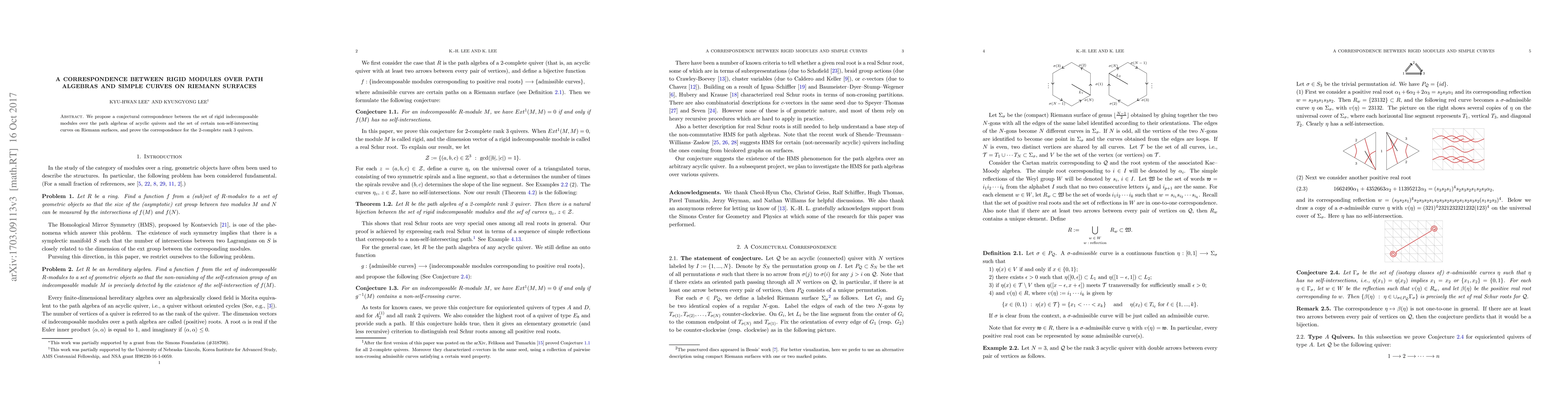 We propose a conjectural correspondence between the set of rigid indecomposable modules over the path algebras of acyclic quivers and the set of certain non-self-intersecting curves on Riemann surfaces, and prove the correspondence for the 2-complete rank 3 quivers.