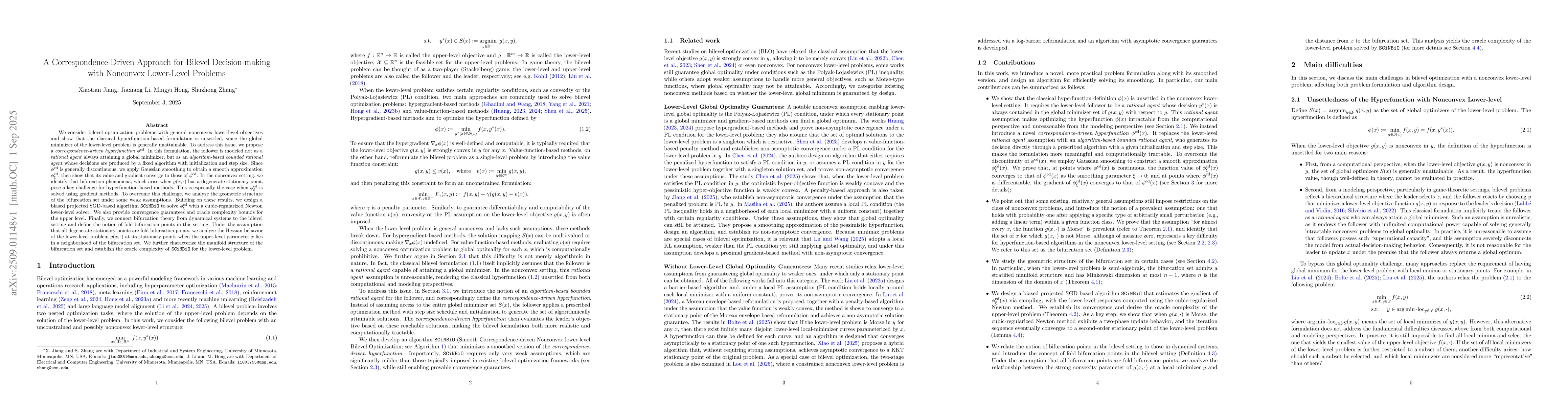 We consider bilevel optimization problems with general nonconvex lower-level objectives and show that the classical hyperfunction-based formulation is unsettled, since the global minimizer of the lower-level problem is generally unattainable. To address this issue, we propose a correspondence-driven hyperfunction $\phi^{\text{cd}}$. In this formulation, the follower is modeled not as a rational agent always attaining a global minimizer, but as an algorithm-based bounded rational agent whose decisions are produced by a fixed algorithm with initialization and step size. Since $\phi^{\text{cd}}$ is generally discontinuous, we apply Gaussian smoothing to obtain a smooth approximation $\phi^{\text{cd}}_\xi$, then show that its value and gradient converge to those of $\phi^{\text{cd}}$. In the nonconvex setting, we identify that bifurcation phenomena, which arise when $g(x,\cdot)$ has a degenerate stationary point, pose a key challenge for hyperfunction-based methods. This is especially the case when $\phi^{\text{cd}}_\xi$ is solved using gradient methods. To overcome this challenge, we analyze the geometric structure of the bifurcation set under some weak assumptions. Building on these results, we design a biased projected SGD-based algorithm SCiNBiO to solve $\phi^{\text{cd}}_\xi$ with a cubic-regularized Newton lower-level solver. We also provide convergence guarantees and oracle complexity bounds for the upper level. Finally, we connect bifurcation theory from dynamical systems to the bilevel setting and define the notion of fold bifurcation points in this setting. Under the assumption that all degenerate stationary points are fold bifurcation points, we establish the oracle complexity of SCiNBiO for the lower-level problem.