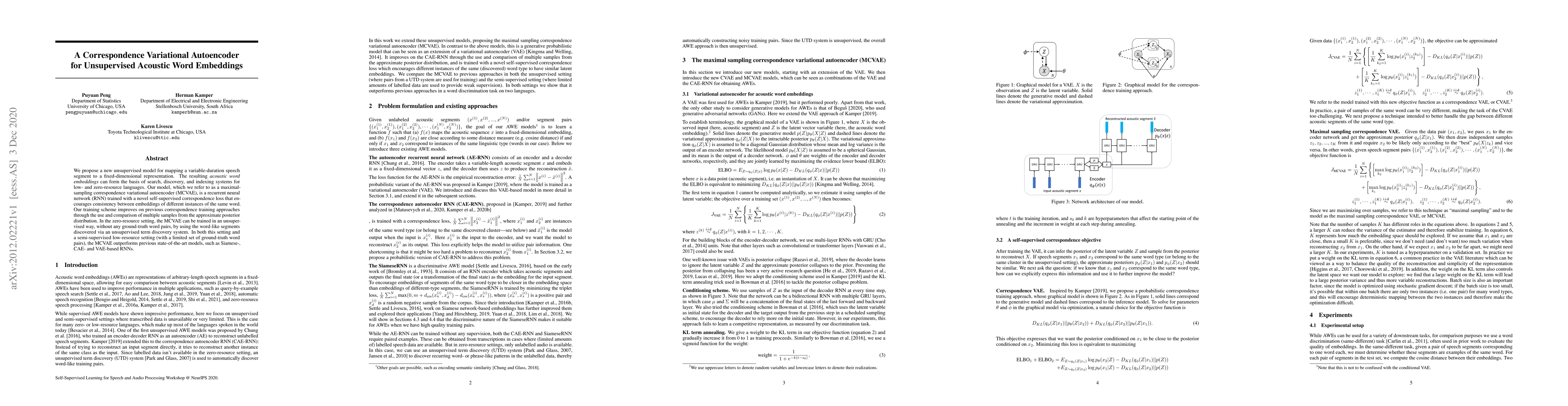 This paper introduces a maximal sampling correspondence variational autoencoder (MCVAE) for generating unsupervised acoustic word embeddings from variable-duration speech. The MCVAE outperforms previous models in low- and zero-resource language settings due to its self-supervised correspondence loss and improved training scheme.
