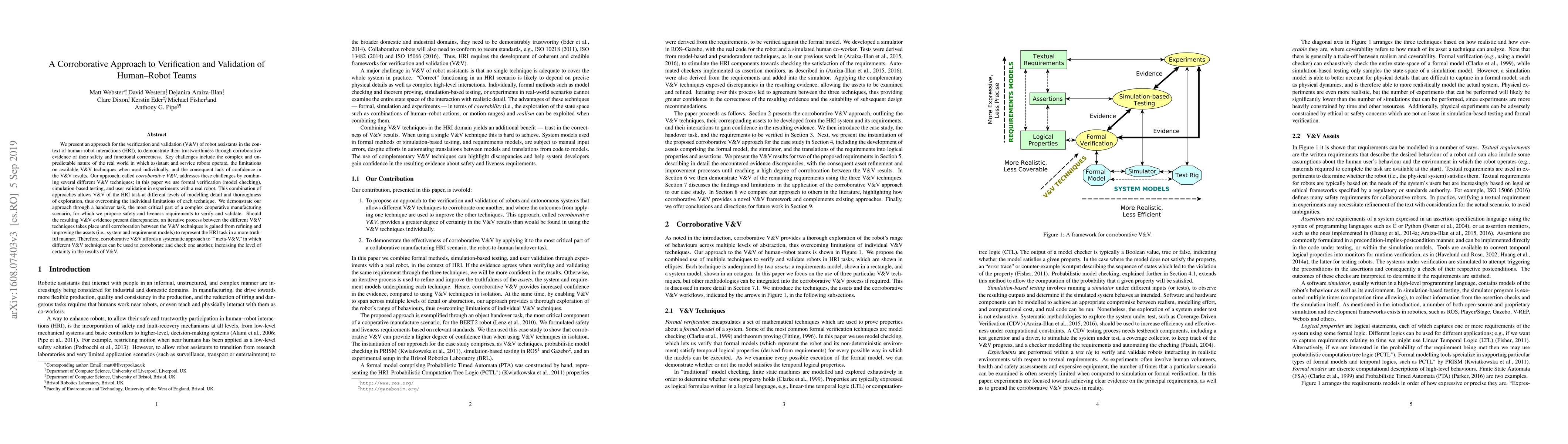 We present an approach for the verification and validation (V&V) of robot assistants in the context of human-robot interactions (HRI), to demonstrate their trustworthiness through corroborative evidence of their safety and functional correctness. Key challenges include the complex and unpredictable nature of the real world in which assistant and service robots operate, the limitations on available V&V techniques when used individually, and the consequent lack of confidence in the V&V results. Our approach, called corroborative V&V, addresses these challenges by combining several different V&V techniques; in this paper we use formal verification (model checking), simulation-based testing, and user validation in experiments with a real robot. We demonstrate our corroborative V&V approach through a handover task, the most critical part of a complex cooperative manufacturing scenario, for which we propose some safety and liveness requirements to verify and validate. We construct formal models, simulations and an experimental test rig for the HRI. To capture requirements we use temporal logic properties, assertion checkers and textual descriptions. This combination of approaches allows V&V of the HRI task at different levels of modelling detail and thoroughness of exploration, thus overcoming the individual limitations of each technique. Should the resulting V&V evidence present discrepancies, an iterative process between the different V&V techniques takes place until corroboration between the V&V techniques is gained from refining and improving the assets (i.e., system and requirement models) to represent the HRI task in a more truthful manner. Therefore, corroborative V&V affords a systematic approach to 'meta-V&V,' in which different V&V techniques can be used to corroborate and check one another, increasing the level of certainty in the results of V&V.