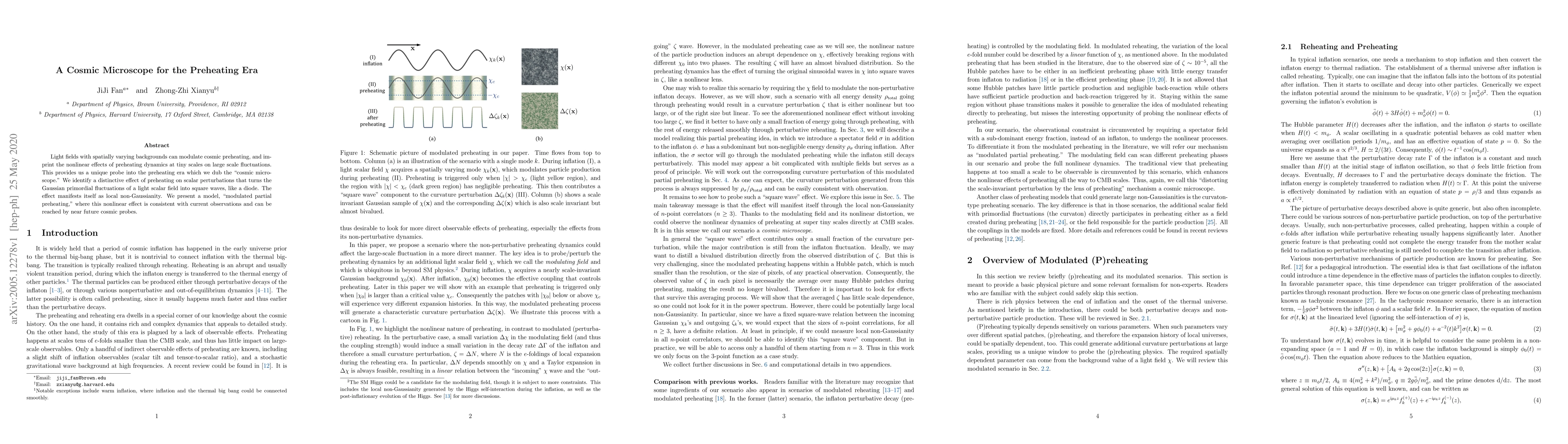 This paper introduces a "cosmic microscope" to study cosmic preheating, revealing how light fields with spatially varying backgrounds imprint nonlinear effects on large scale fluctuations. The study identifies a unique effect that transforms Gaussian primordial fluctuations into square waves, manifesting as local non-Gaussianity, and proposes a model, "modulated partial preheating," consistent with current observations and detectable by future cosmic probes.
