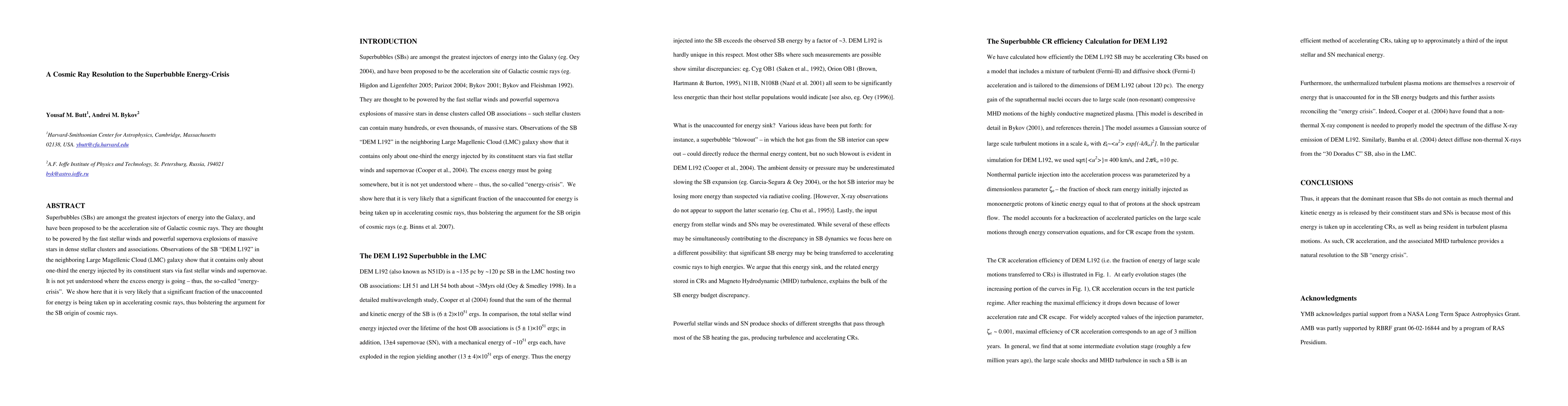 Superbubbles (SBs) are amongst the greatest injectors of energy into the Galaxy, and have been proposed to be the acceleration site of Galactic cosmic rays. They are thought to be powered by the fast stellar winds and powerful supernova explosions of massive stars in dense stellar clusters and associations. Observations of the SB 'DEM L192' in the neighboring Large Magellenic Cloud (LMC) galaxy show that it contains only about one-third the energy injected by its constituent stars via fast stellar winds and supernovae. It is not yet understood where the excess energy is going, thus, the so-called 'energy crisis'. We show here that it is very likely that a significant fraction of the unaccounted for energy is being taken up in accelerating cosmic rays, thus bolstering the argument for the SB origin of cosmic rays.