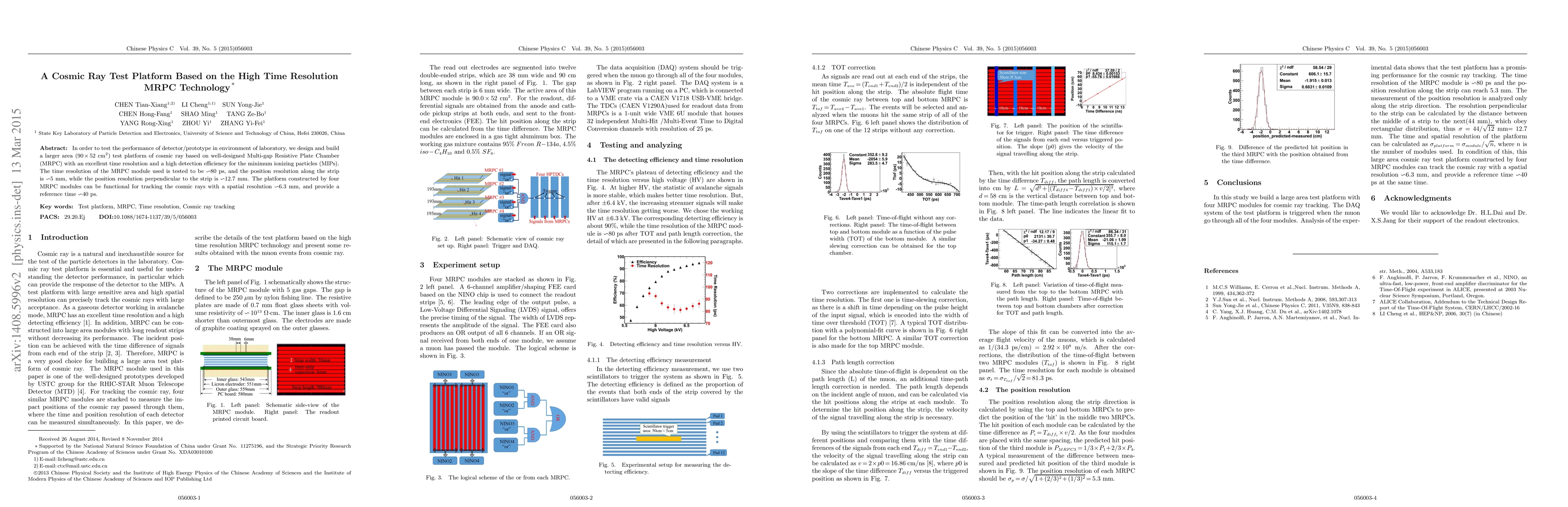This paper describes a large-area cosmic ray test platform utilizing high-time resolution Multi-gap Resistive Plate Chambers (MRPC) for detecting minimum ionizing particles. The platform, composed of four MRPC modules, achieves a spatial resolution of ~6.3 mm and a reference time of ~40 ps.