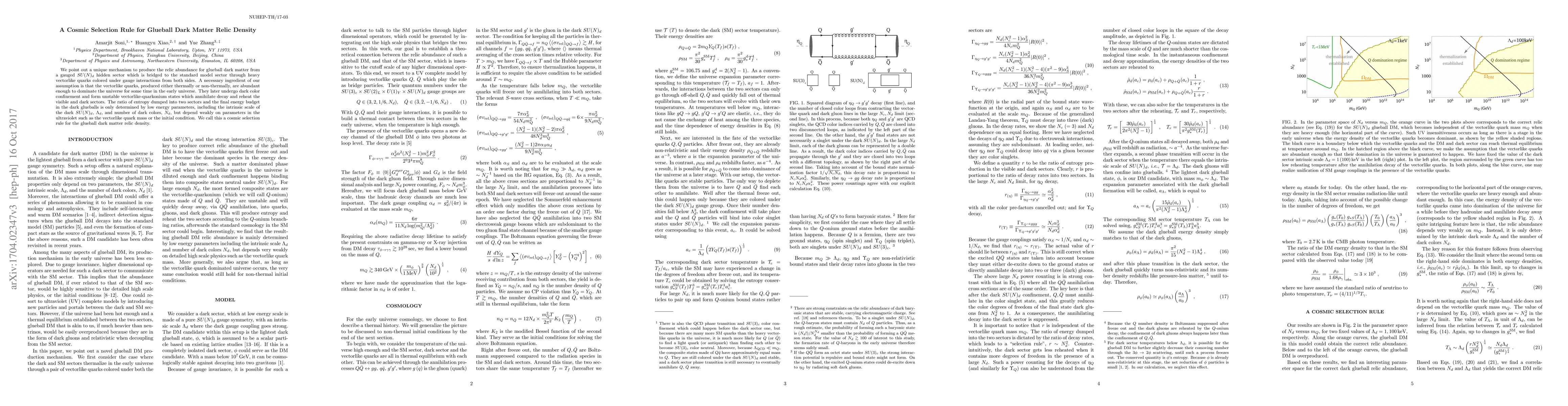 We point out a unique mechanism to produce the relic abundance for glueball dark matter from a gauged $SU(N)_d$ hidden sector which is bridged to the standard model sector through heavy vectorlike quarks colored under gauge interactions from both sides. A necessary ingredient of our assumption is that the vectorlike quarks, produced either thermally or non-thermally, are abundant enough to dominate the universe for some time in the early universe. They later undergo dark color confinement and form unstable vectorlike-quarkonium states which annihilate decay and reheat the visible and dark sectors. The ratio of entropy dumped into two sectors and the final energy budget in the dark glueballs is only determined by low energy parameters, including the intrinsic scale of the dark $SU(N)_d$, $\Lambda_d$, and number of dark colors, $N_d$, but depend weakly on parameters in the ultraviolet such as the vectorlike quark mass or the initial condition. We call this a cosmic selection rule for the glueball dark matter relic density.