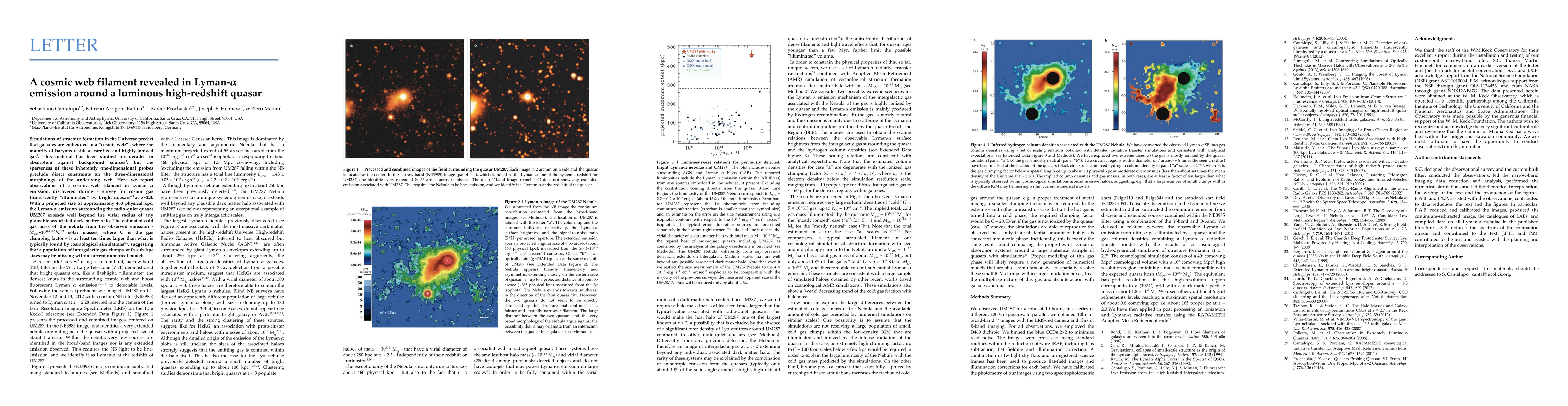 This paper reports the discovery of a cosmic web filament in Lyman-alpha emission around a high-redshift quasar, revealing a large, rarefied gas structure extending beyond the virial radius of any associated dark matter halo. The findings suggest that current cosmological simulations may underestimate the mass and complexity of intergalactic gas clumps.