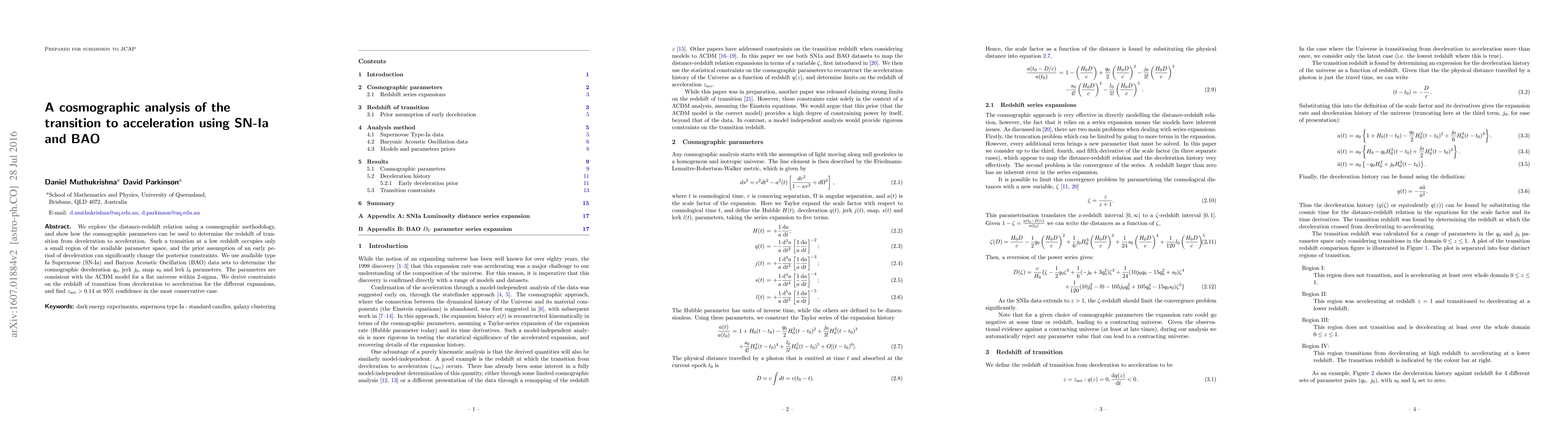 We explore the distance-redshift relation using a cosmographic methodology, and show how the cosmographic parameters can be used to determine the redshift of transition from deceleration to acceleration. Such a transition at a low redshift occupies only a small region of the available parameter space, and the prior assumption of an early period of deceleration can significantly change the posterior constraints. We use available type Ia Supernovae (SN-Ia) and Baryon Acoustic Oscillation (BAO) data sets to determine the cosmographic deceleration $q_0$, jerk $j_0$, snap $s_0$ and lerk $l_0$ parameters. The parameters are consistent with the $\Lambda$CDM model for a flat universe within 2-sigma. We derive constraints on the redshift of transition from deceleration to acceleration for the different expansions, and find $z_{\rm acc} > 0.14$ at 95% confidence in the most conservative case.