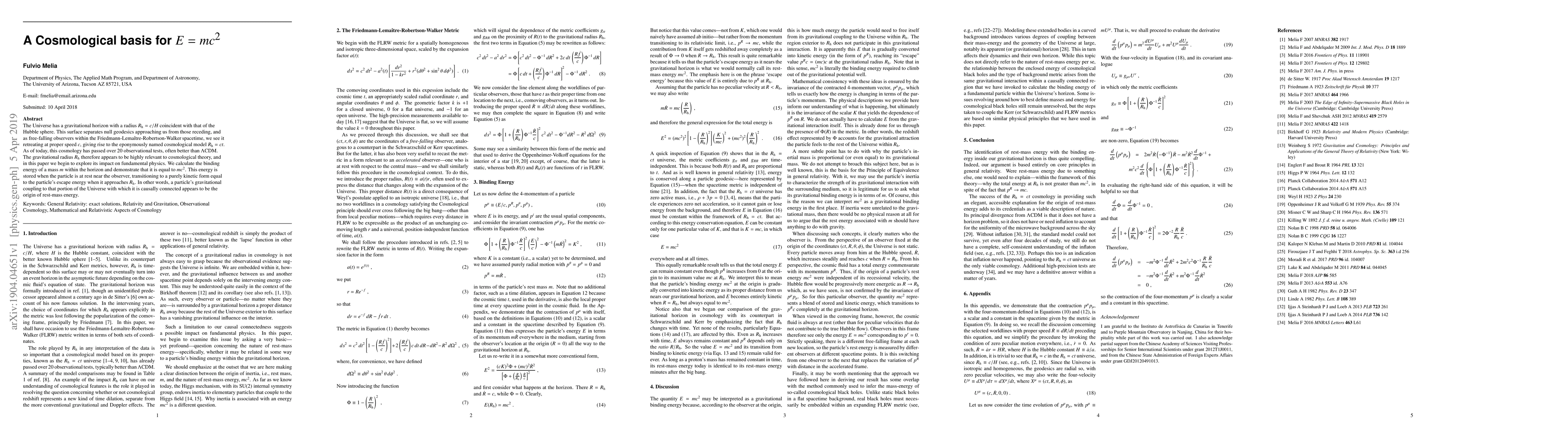 The Universe has a gravitational horizon with a radius R_h=c/H coincident with that of the Hubble sphere. This surface separates null geodesics approaching us from those receding, and as free-falling observers within the Friedmann-Lemaitre-Robertson-Walker spacetime, we see it retreating at proper speed c, giving rise to the eponymously named cosmological model R_h=ct. As of today, this cosmology has passed over 25 observational tests, often better than LCDM. The gravitational/Hubble radius R_h therefore appears to be highly relevant to cosmological theory, and in this paper we begin to explore its impact on fundamental physics. We calculate the binding energy of a mass m within the horizon and demonstrate that it is equal to mc^2. This energy is stored when the particle is at rest near the observer, transitioning to a purely kinetic form equal to the particle's escape energy when it approaches R_h. In other words, a particle's gravitational coupling to that portion of the Universe with which it is causally connected appears to be the origin of rest-mass energy.