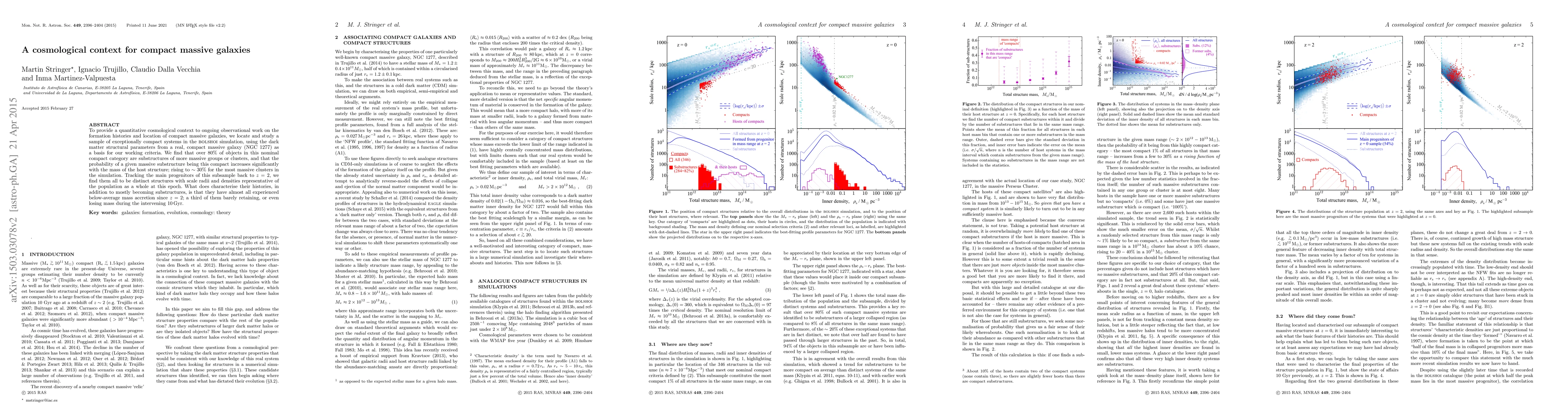 To provide a quantitative cosmological context to ongoing observational work on the formation histories and location of compact massive galaxies, we locate and study a sample of exceptionally compact systems in the Bolshoi simulation, using the dark matter structural parameters from a real, compact massive galaxy (NGC 1277) as a basis for our working criteria. We find that over 80% of objects in this nominal compact category are substructures of more massive groups or clusters, and that the probability of a given massive substructure being this compact increases significantly with the mass of the host structure; rising to ~30% for the most massive clusters in the simulation. Tracking the main progenitors of this subsample back to z=2, we find them all to be distinct structures with scale radii and densities representative of the population as a whole at this epoch. What does characterise their histories, in addition to mostly becoming substructures, is that they have almost all experienced below-average mass accretion since z=2; a third of them barely retaining, or even losing mass during the intervening 10 Gyr.