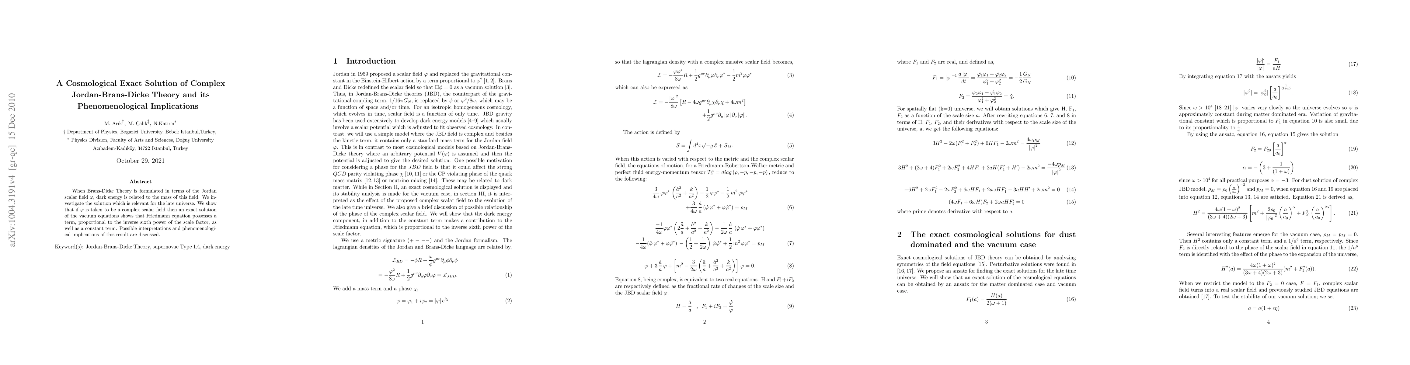 When Brans-Dicke Theory is formulated in terms of the Jordan scalar field \phi, dark energy is related to the mass of this field. We show that if \phi is taken to be a complex scalar field then an exact solution of the vacuum equations shows that Friedmann equation possesses a term, proportional to the inverse sixth power of the scale factor, as well as a constant term. Possible interpretations and phenomenological implications of this result are discussed.