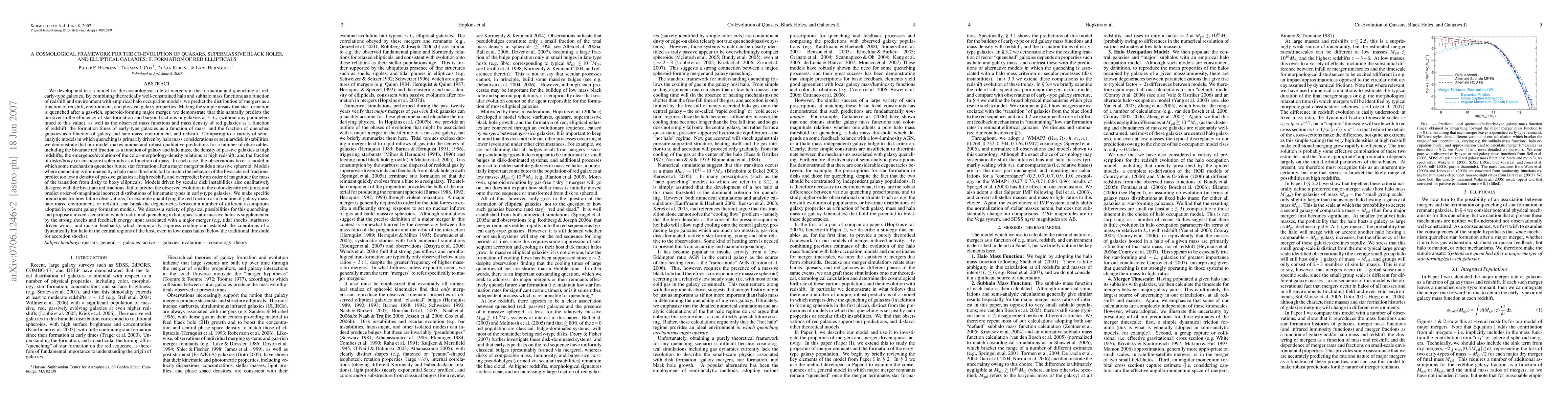 (Abridged) We develop and test a model for the cosmological role of mergers in the formation and quenching of red, early-type galaxies. Making the ansatz that star formation is quenched after a gas-rich, spheroid-forming major merger, we demonstrate that this naturally predicts the turnover in the efficiency of star formation at ~L_star, as well as the observed mass functions/density of red galaxies as a function of redshift, the formation times of spheroids as a function of mass, and the fraction of quenched galaxies as a function of galaxy and halo mass, environment, and redshift. Comparing to a variety of semi-analytic models in which quenching is primarily driven by halo mass considerations or secular/disk instabilities, we demonstrate that our model and different broad classes of models make unique and robust qualitative predictions for a number of observables, including the red fraction as a function of galaxy and halo mass, the density of passive galaxies and evolution of the color-morphology-density relations at high z, and the fraction of disky/boxy spheroids as a function of mass. In each case, the observations favor a model in which galaxies quench after a major merger builds a massive spheroid, and disfavor quenching via secular or pure halo processes. We discuss a variety of physical possibilities for this quenching, and propose a mixed scenario in which traditional quenching in hot, massive halos is supplemented by the feedback associated with star formation and quasar activity in a major merger, which temporarily suppress cooling and establish the conditions of a dynamically hot halo in the central regions of the host, even in low mass halos.