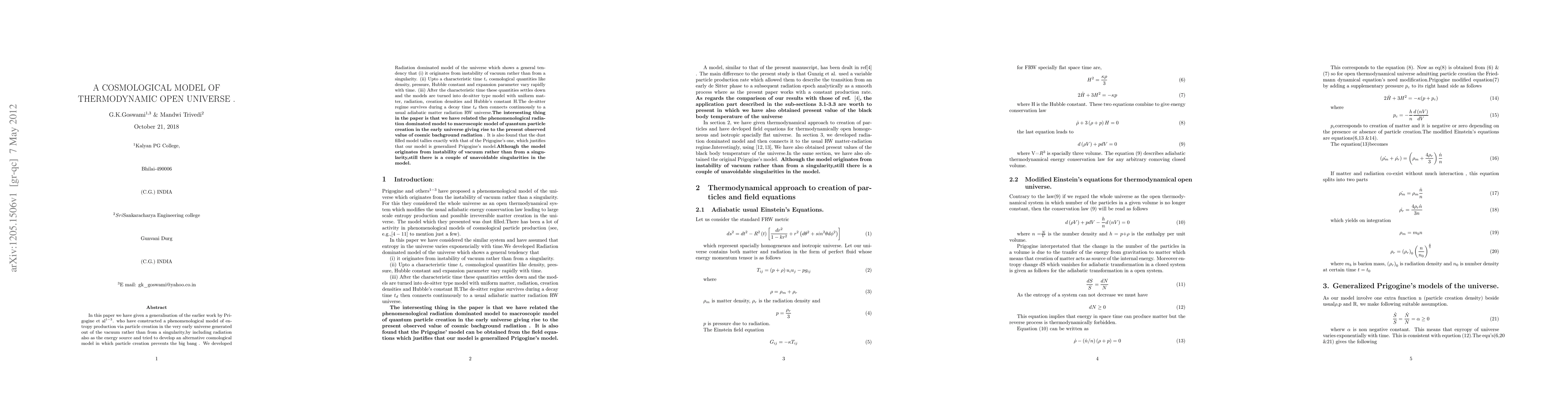 In this paper we have given a generalisation of the earlier work by Prigogine et al. who have constructed a phenomenological model of entropy production via particle creation in the very early universe generated out of the vacuum rather than from a singularity, by including radiation also as the energy source and tried to develop an alternative cosmological model in which particle creation prevents the big bang. We developed Radiation dominated model of the universe which shows a general tendency that (i) it originates from instability of vacuum rather than from a singularity. (ii) Up to a characteristic time cosmological quantities like density, pressure, Hubble constant and expansion parameter vary rapidly with time. (iii) After the characteristic time these quantities settles down and the models are turned into de-sitter type model with uniform matter, radiation, creation densities and Hubble's constant H. The de-sitter regime survives during a decay time then connects continuously to a usual adiabatic matter radiation RW universe.The interesting thing in the paper is that we have related the phenomenological radiation dominated model to macroscopic model of quantum particle creation in the early universe giving rise to the present observed value of cosmic background radiation . It is also found that the dust filled model tallies exactly with that of the Prigogine's one, which justifies that our model is generalized Prigogine's model. Although the model originates from instability of vacuum rather than from a singularity, still there is a couple of unavoidable singularities in the model.