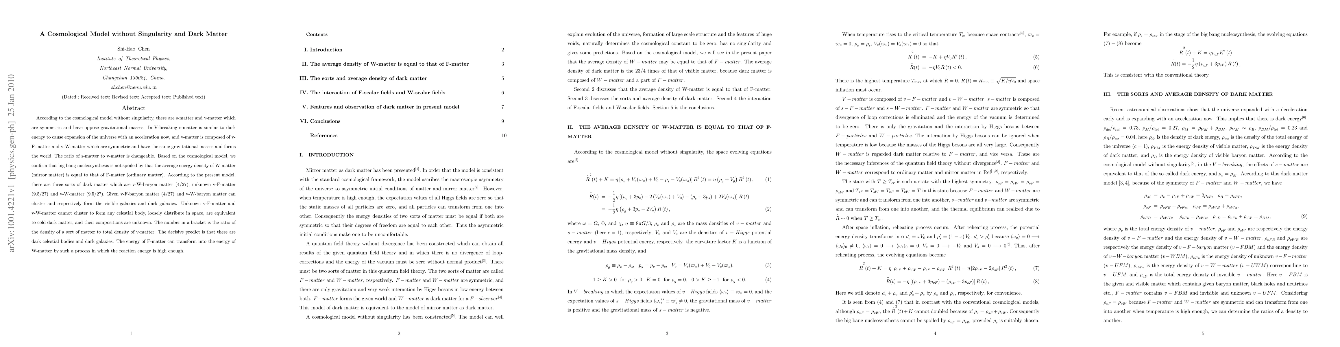 A new cosmological model proposes that dark matter and singularity do not exist, instead proposing s-matter and v-matter with opposite gravitational masses to explain the universe's expansion.