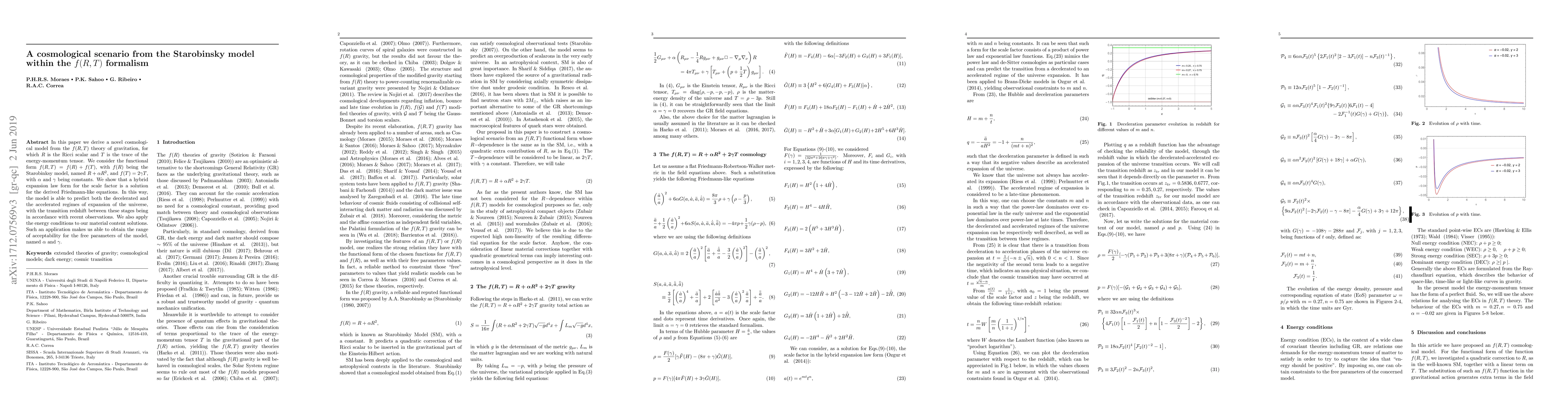 In this paper we derive a novel cosmological model from the $f(R,T)$ theory of gravitation, for which $R$ is the Ricci scalar and $T$ is the trace of the energy-momentum tensor. We consider the functional form $f(R,T)=f(R)+f(T)$, with $f(R)$ being the Starobinksy model, named $R+\alpha R^{2}$, and $f(T)=2\gamma T$, with $\alpha$ and $\gamma$ being constants. We show that a hybrid expansion law form for the scale factor is a solution for the derived Friedmann-like equations. In this way, the model is able to predict both the decelerated and the accelerated regimes of expansion of the universe, with the transition redshift between these stages being in accordance with recent observations. We also apply the energy conditions to our material content solutions. Such an application makes us able to obtain the range of acceptability for the free parameters of the model, named $\alpha$ and $\gamma$.