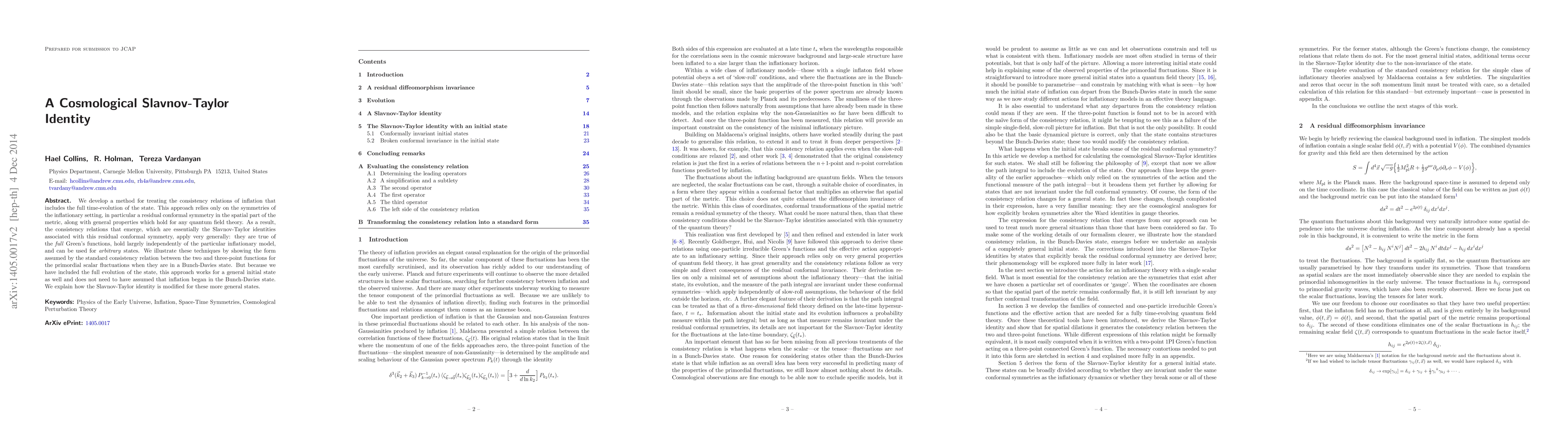 The paper introduces a cosmological Slavnov-Taylor identity, generalizing previous work by incorporating the full time-evolution of states and relying on residual symmetries, thus providing a more robust framework for consistency relations in inflationary cosmology.