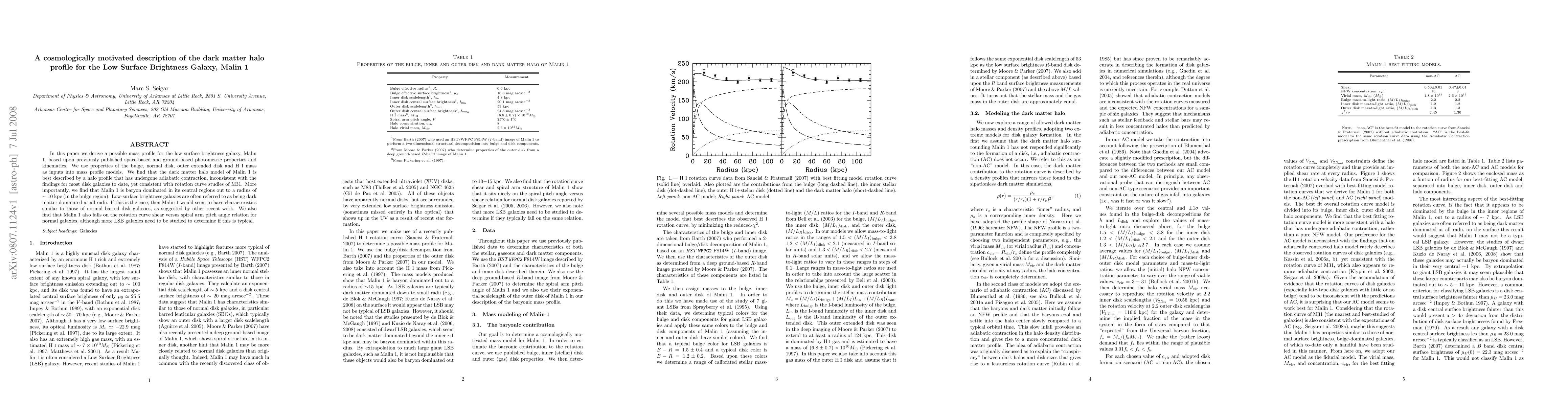 This paper derives a mass profile for the low surface brightness galaxy Malin 1, finding it best described by an adiabatically contracted dark matter halo, unlike most disk galaxies. It suggests Malin 1 is baryon dominated in its central regions, challenging the typical dark matter dominance of low-surface brightness galaxies.