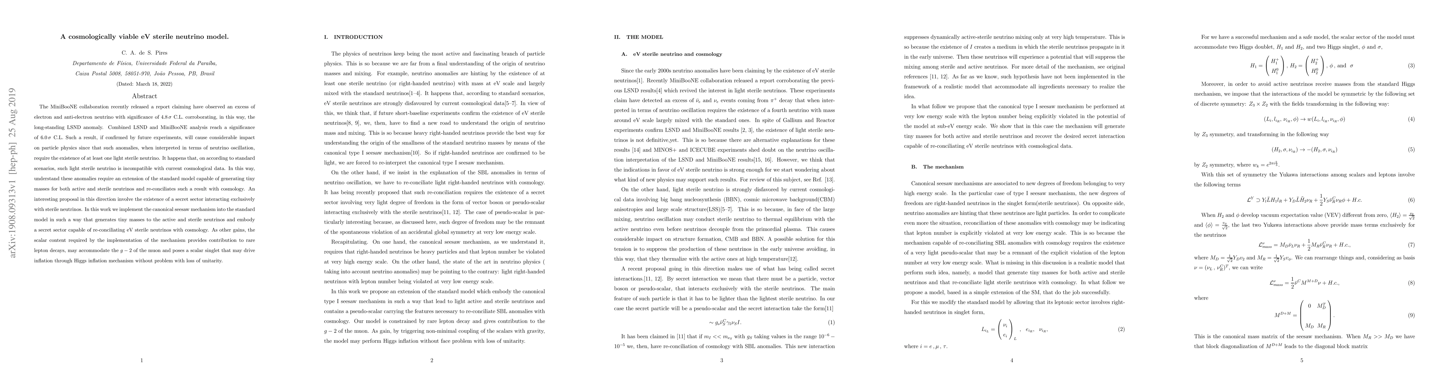The MiniBooNE collaboration recently released a report claiming have observed an excess of electron and anti-electron neutrino with significance of $4.8 \, \sigma$ C.L. corroborating, in this way, the long-standing LSND anomaly. Combined LSND and MiniBooNE analysis reach a significance of $6.0\, \sigma$ C.L. Such a result, if confirmed by future experiments, will cause considerable impact on particle physics since that such anomalies, when interpreted in terms of neutrino oscillation, require the existence of at least one light sterile neutrino. It happens that, on according to standard scenarios, such light sterile neutrino is incompatible with current cosmological data. In this way, understand these anomalies require an extension of the standard model capable of generating tiny masses for both active and sterile neutrinos and re-conciliates such a result with cosmology. An interesting proposal in this direction involve the existence of a secret sector interacting exclusively with sterile neutrinos. In this work we implement the canonical seesaw mechanism into the standard model in such a way that generates tiny masses to the active and sterile neutrinos and embody a secret sector capable of re-conciliating eV sterile neutrinos with cosmology. As other gains, the scalar content required by the implementation of the mechanism provides contribution to rare lepton decays, may accommodate the $g-2$ of the muon and poses a scalar singlet that may drive inflation through Higgs inflation mechanism without problem with loss of unitarity.