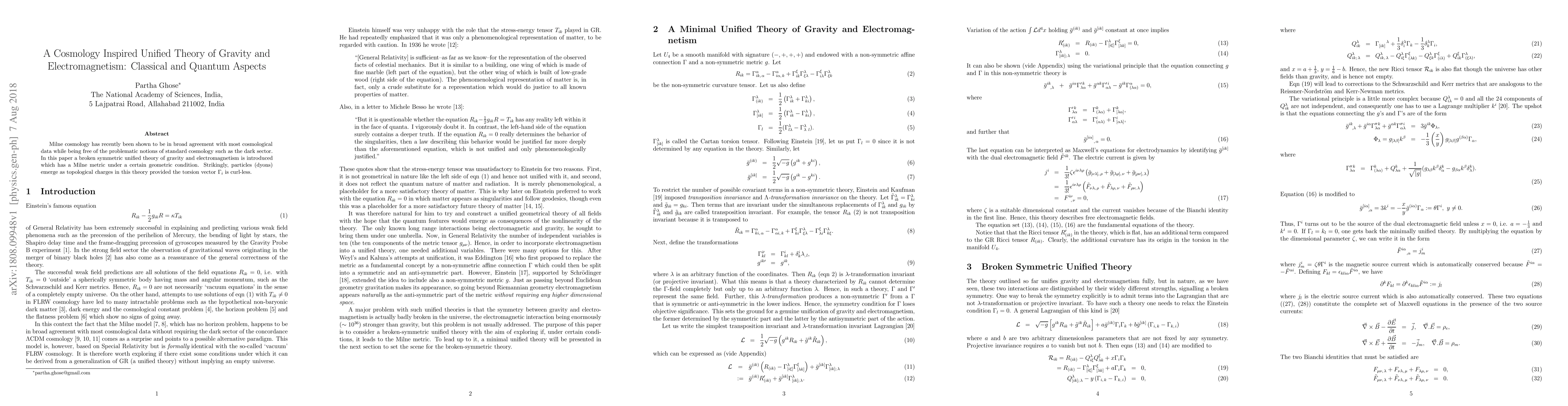 This paper proposes a unified theory of gravity and electromagnetism based on Milne cosmology, which avoids dark sector issues. It introduces a broken symmetric framework where particles emerge as topological charges under specific geometric conditions, particularly when the torsion vector is curl-less.