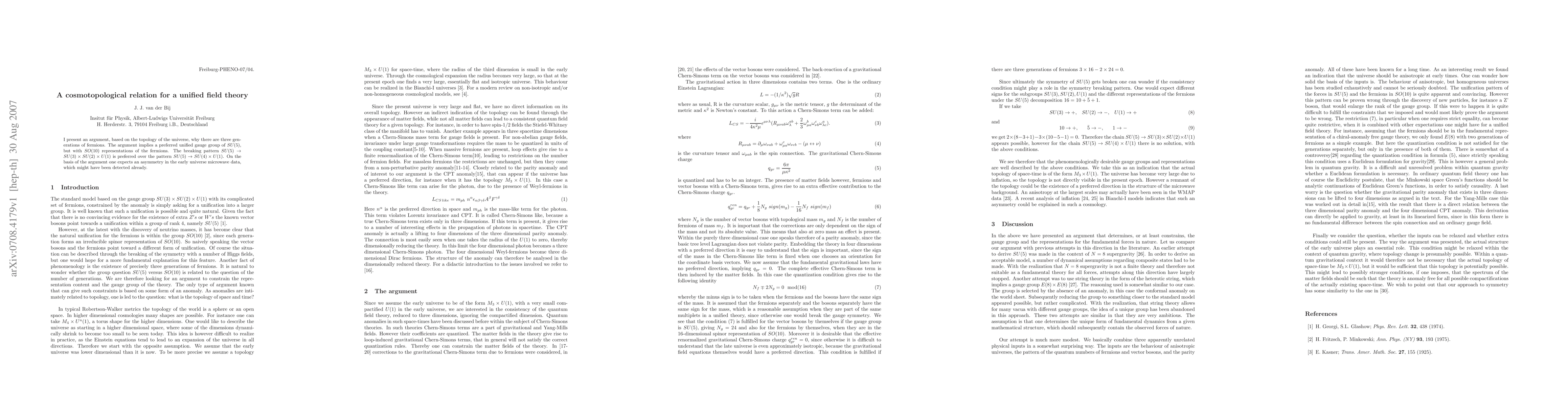 I present an argument, based on the topology of the universe, why there are three generations of fermions. The argument implies a preferred unified gauge group of SU(5), but with SO(10) representations of the fermions. The breaking pattern $SU(5) \to SU(3) \times SU(2) \times U(1)$ is preferred over the pattern $SU(5) \to SU(4) \times U(1)$. On the basis of the argument one expects an asymmetry in the microwave data, which might have been detected already.