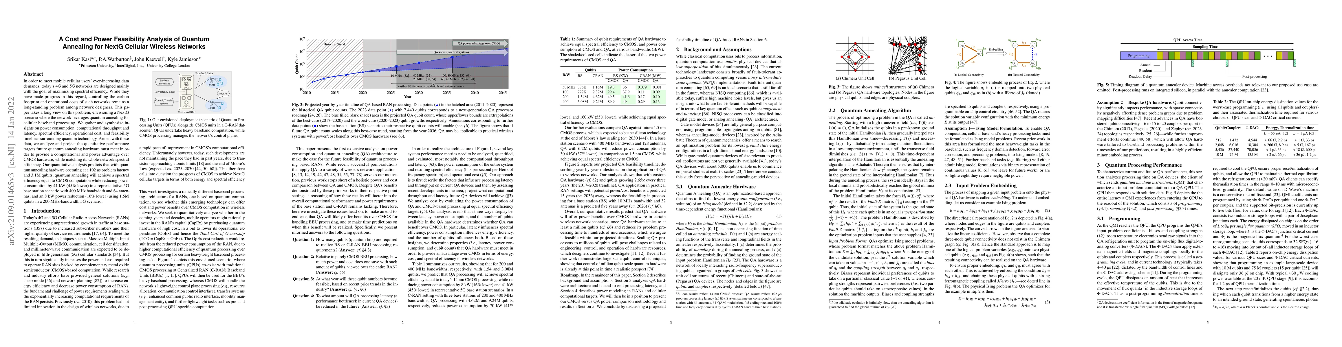 In order to meet mobile cellular users' ever-increasing data demands, today's 4G and 5G networks are designed mainly with the goal of maximizing spectral efficiency. While they have made progress in this regard, controlling the carbon footprint and operational costs of such networks remains a long-standing problem among network designers. This paper takes a long view on this problem, envisioning a NextG scenario where the network leverages quantum annealing for cellular baseband processing. We gather and synthesize insights on power consumption, computational throughput and latency, spectral efficiency, operational cost, and feasibility timelines surrounding quantum technology. Armed with these data, we analyze and project the quantitative performance targets future quantum annealing hardware must meet in order to provide a computational and power advantage over CMOS hardware, while matching its whole-network spectral efficiency. Our quantitative analysis predicts that with quantum annealing hardware operating at a 102 $\mu$s problem latency and 3.1M qubits, quantum annealing will achieve a spectral efficiency equal to CMOS computation while reducing power consumption by 41 kW (45% lower) in a representative 5G base station scenario with 400 MHz bandwidth and 64 antennas, and an 8 kW power reduction (16% lower) using 1.5M qubits in a 200 MHz-bandwidth 5G scenario.