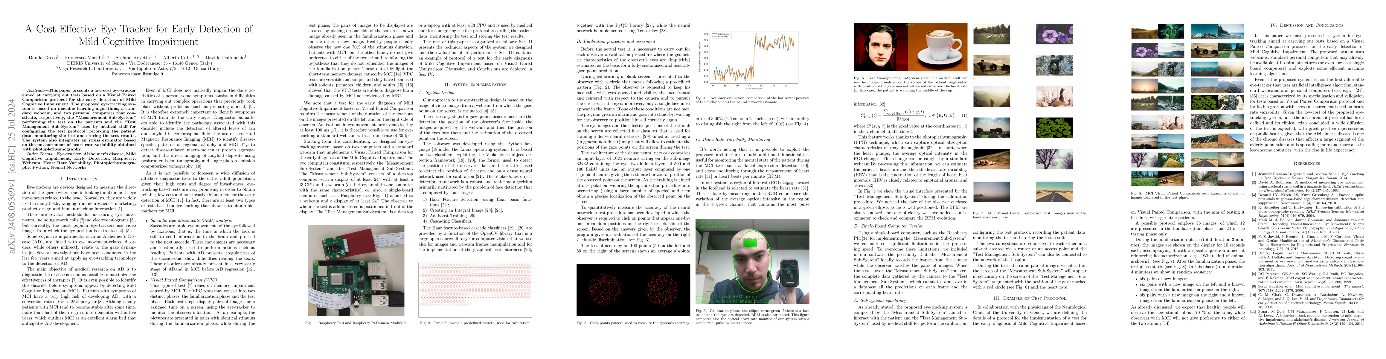 This paper introduces a cost-effective eye-tracking system using a webcam and machine learning for early detection of Mild Cognitive Impairment via Visual Paired Comparison tests. It includes a stress estimator using photoplethysmography to measure heart rate variability.
