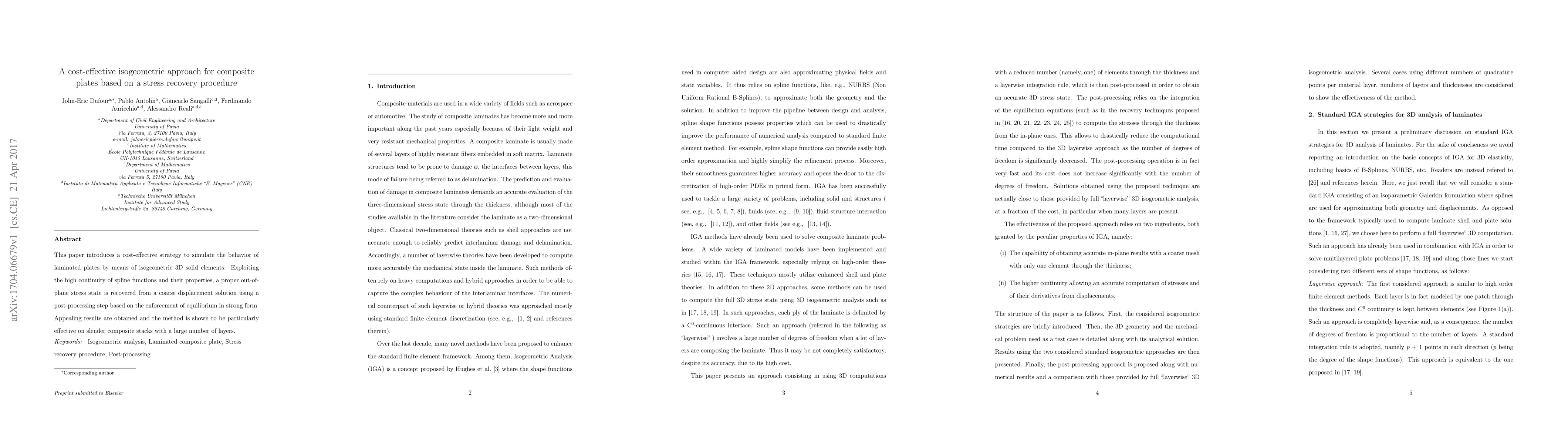 Summary: This paper presents a cost-effective isogeometric method for simulating laminated composite plates using 3D solid elements, leveraging spline functions for high continuity and a stress recovery procedure to enforce equilibrium, yielding accurate results especially for slender, multi-layered structures.