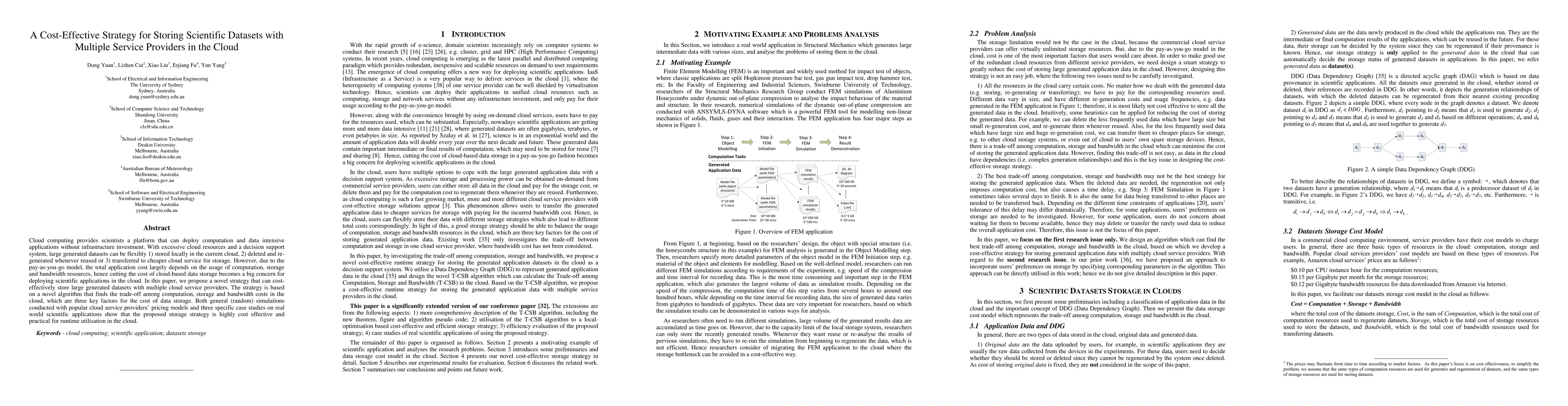 This paper proposes a cost-effective strategy for storing scientific datasets using multiple cloud service providers, leveraging a novel algorithm to balance computation, storage, and bandwidth costs. The strategy is shown to be practical and effective through simulations and real-world case studies.