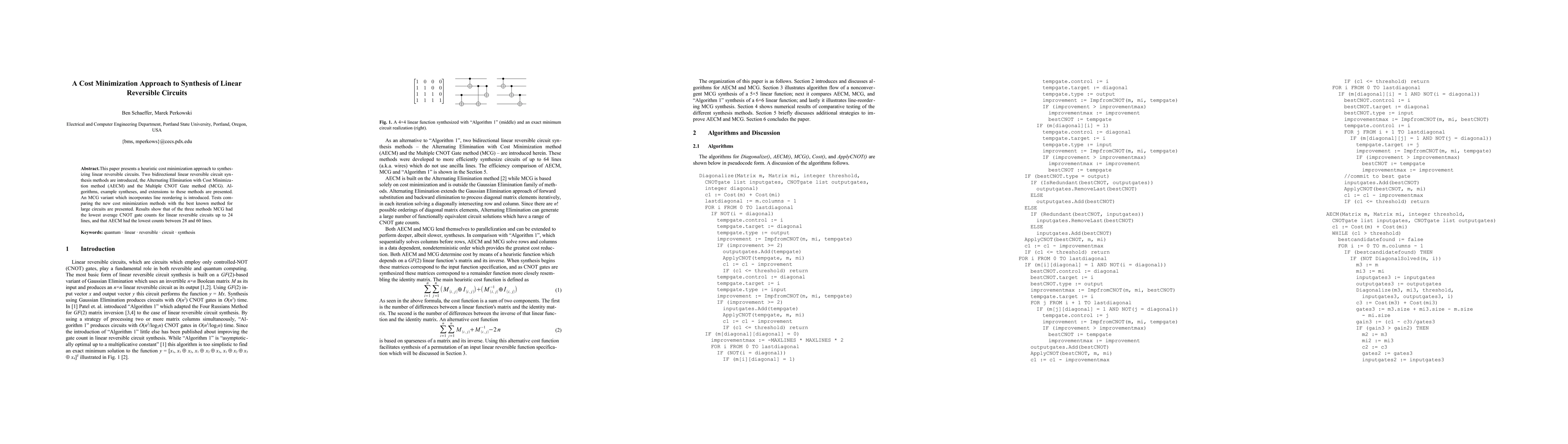 This paper introduces two new methods, AECM and MCG, for synthesizing linear reversible circuits with cost minimization, showing that MCG is most efficient for smaller circuits and AECM for medium-sized ones. Comparative tests indicate MCG’s lower average CNOT gate counts for circuits up to 24 lines, while AECM outperforms for sizes between 28 and 60 lines.