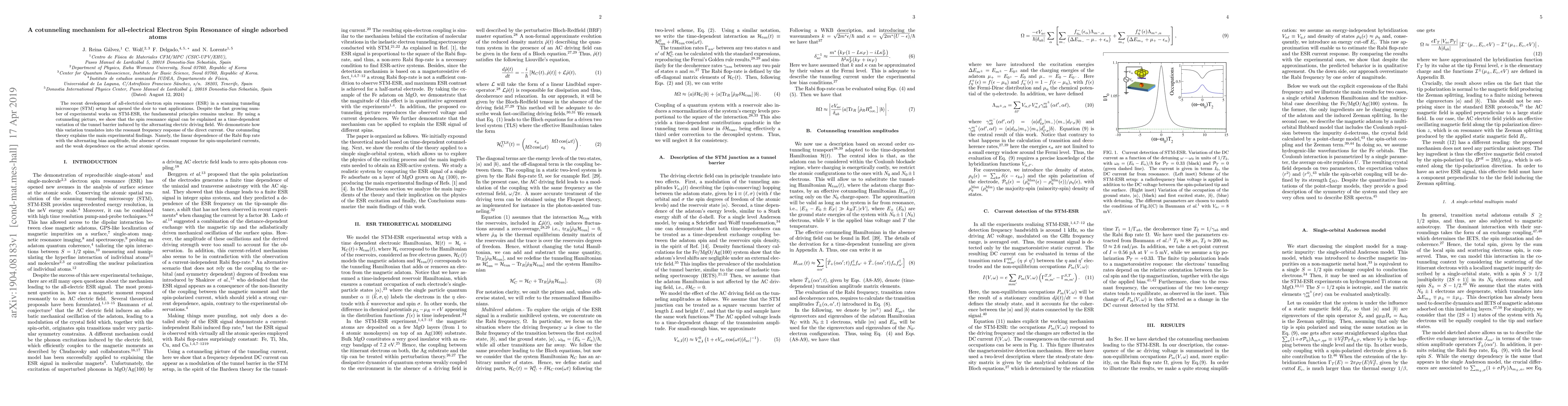 The recent development of all-electrical electron spin resonance (ESR) in a scanning tunneling microscope (STM) setup has opened the door to vast applications. Despite the fast growing number of experimental works on STM-ESR, the fundamental principles remains unclear. By using a cotunneling picture, we show that the spin resonance signal can be explained as a time-dependent variation of the tunnel barrier induced by the alternating electric driving field. We demonstrate how this variation translates into the resonant frequency response of the direct current. Our cotunneling theory explains the main experimental findings. Namely, the linear dependence of the Rabi flop rate with the alternating bias amplitude, the absence of resonant response for spin-unpolarized currents, and the weak dependence on the actual atomic species.