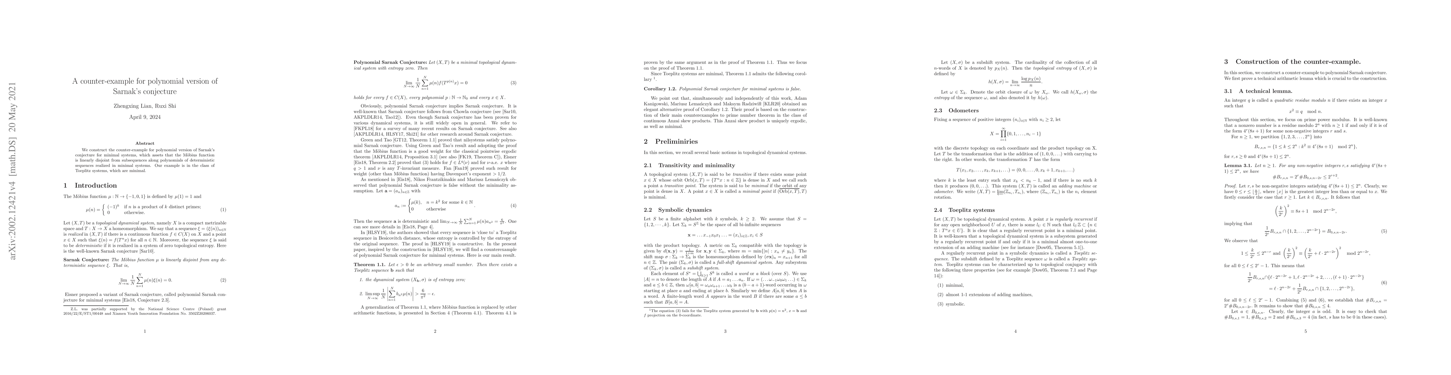 Summary: This paper presents a counter-example disproving the polynomial version of Sarnak's conjecture for minimal systems, specifically showing that the Möbius function is not linearly disjoint from subsequences along polynomials in Toeplitz systems, a class of minimal systems.