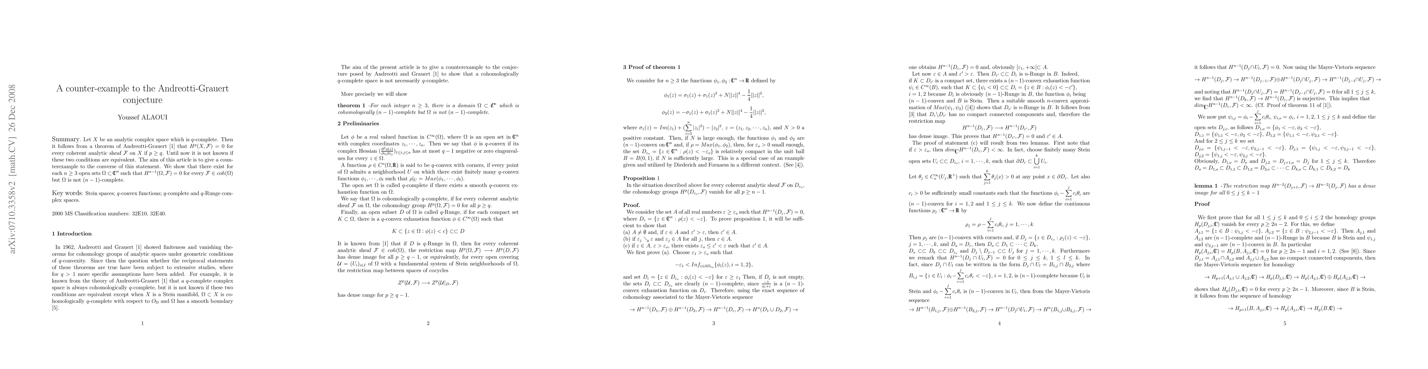 Let $X$ be an analytic complex space which is $q$-complete. Then it follows from a theorem of Andreotti-Grauert [1] that $H^{p}(X, {\mathcal{F}})=0$ for every coherent analytic sheaf ${\mathcal{F}}$ on $X$ if $p\geq q$. Until now it is not known if these two conditions are equivalent. The aim of this article is to give a counterexample to the converse of this statement. We show that there exist for each $n\geq 3$ open sets $\Omega\subset\complexes^{n}$ such that $H^{n-1}(\Omega, {\mathcal{F}})=0$ for every ${\mathcal{F}}\in coh(\Omega)$ but $\Omega$ is not $(n-1)$-complete.