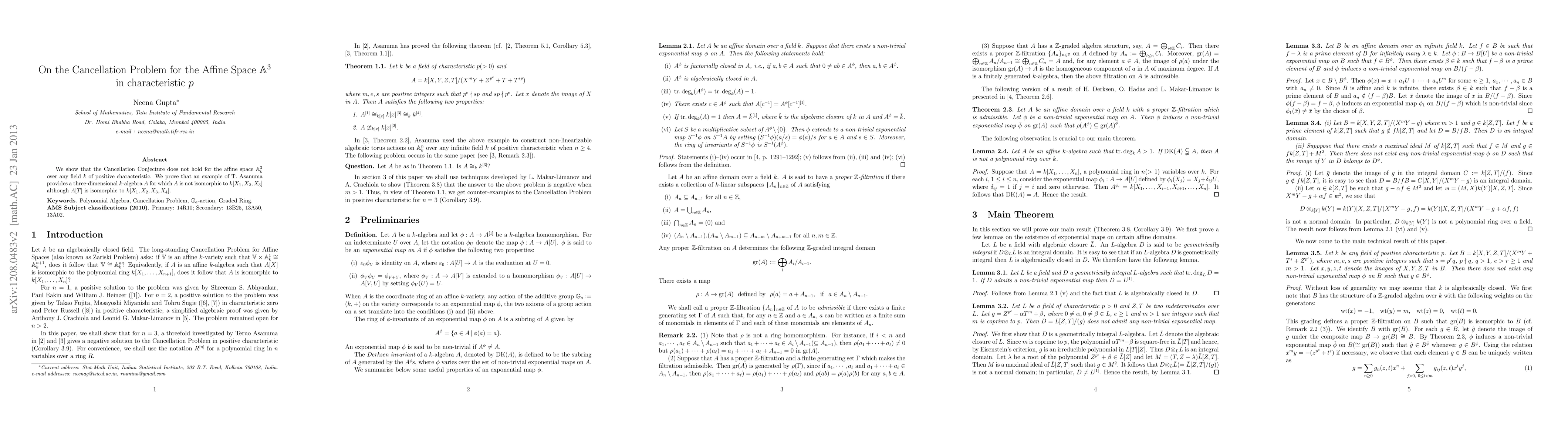 We show that the Cancellation Conjecture does not hold for the affine space A^3_k over any field k of positive characteristic. We prove that an example of T. Asanuma provides a three-dimensional k-algebra A for which A is not isomorphic to k[X_1,X_2,X_3] although A[T] is isomorphic to k[X_1, X_2, X_3, X_4].