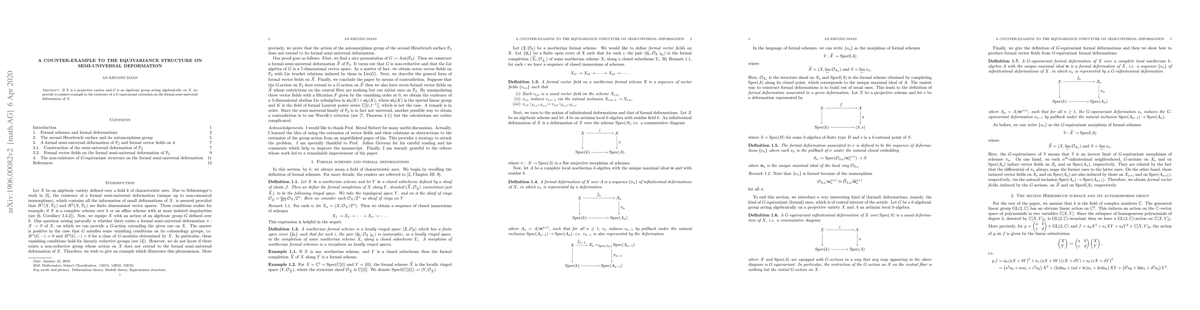 Researchers provide a counterexample to the existence of a G-equivariant extension on the formal semi-universal deformation of a projective variety X, challenging the idea of equivariance in algebraic group actions.