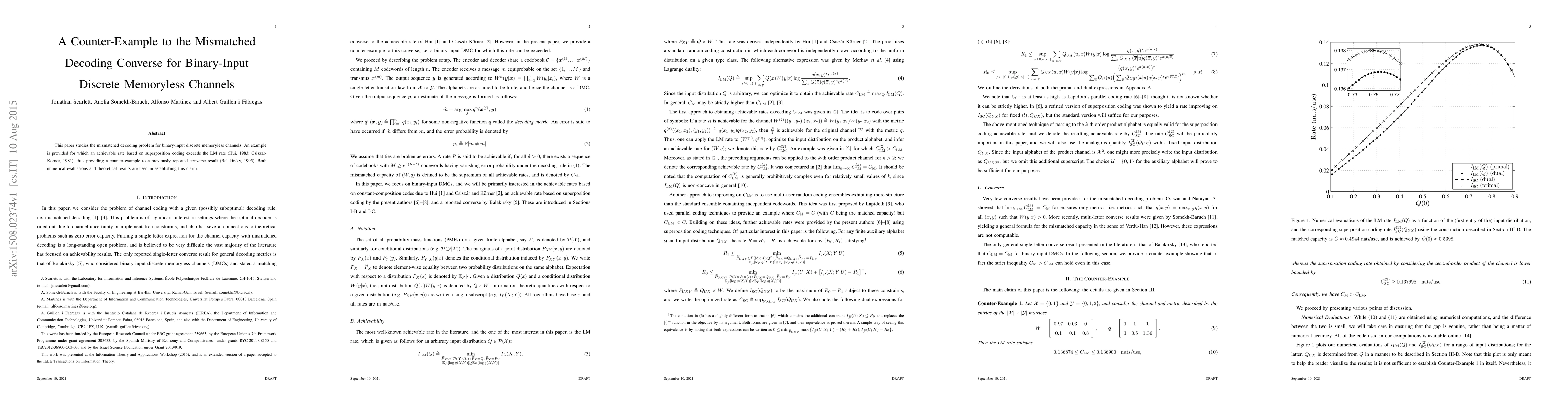 This paper presents a counter-example to a previously reported converse result in mismatched decoding for binary-input discrete memoryless channels, demonstrating that superposition coding can achieve a higher rate than the LM rate. Both numerical evaluations and theoretical analysis support this finding.