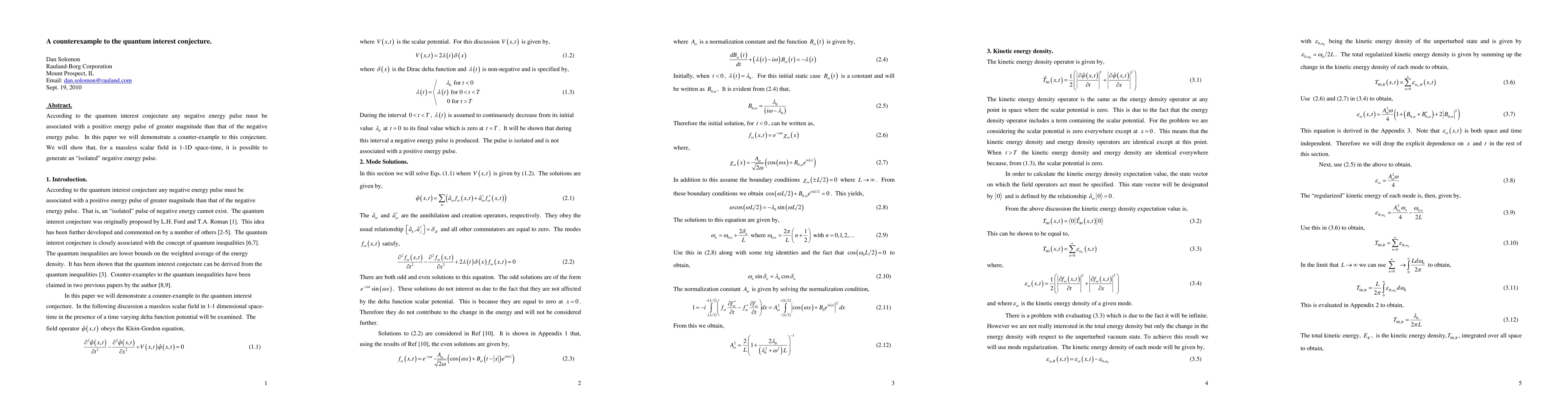 This paper refutes the quantum interest conjecture by demonstrating a massless scalar field in 1-1D space-time that generates an isolated negative energy pulse, without a corresponding positive energy pulse of greater magnitude. This finding challenges the notion that negative energy pulses must always be paired with larger positive energy pulses.
