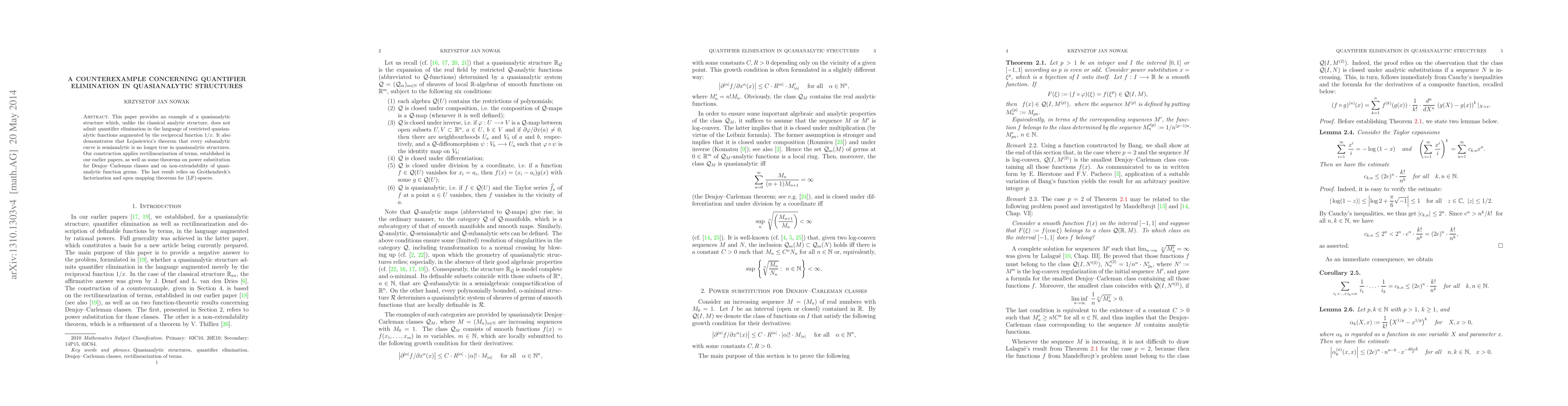 This paper presents a quasianalytic structure that lacks quantifier elimination, contrasting with classical analytic structures, and shows that Lojasiewicz's theorem on subanalytic curves does not hold in quasianalytic settings. The findings rely on rectilinearization techniques and theorems on Denjoy-Carleman classes, supported by Grothendieck's factorization and open mapping theorems.